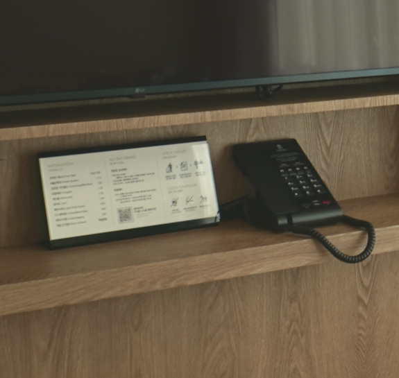티비 아랫쪽에 간단하게 안내가 되어있고 전화기도 놓여있었어요.