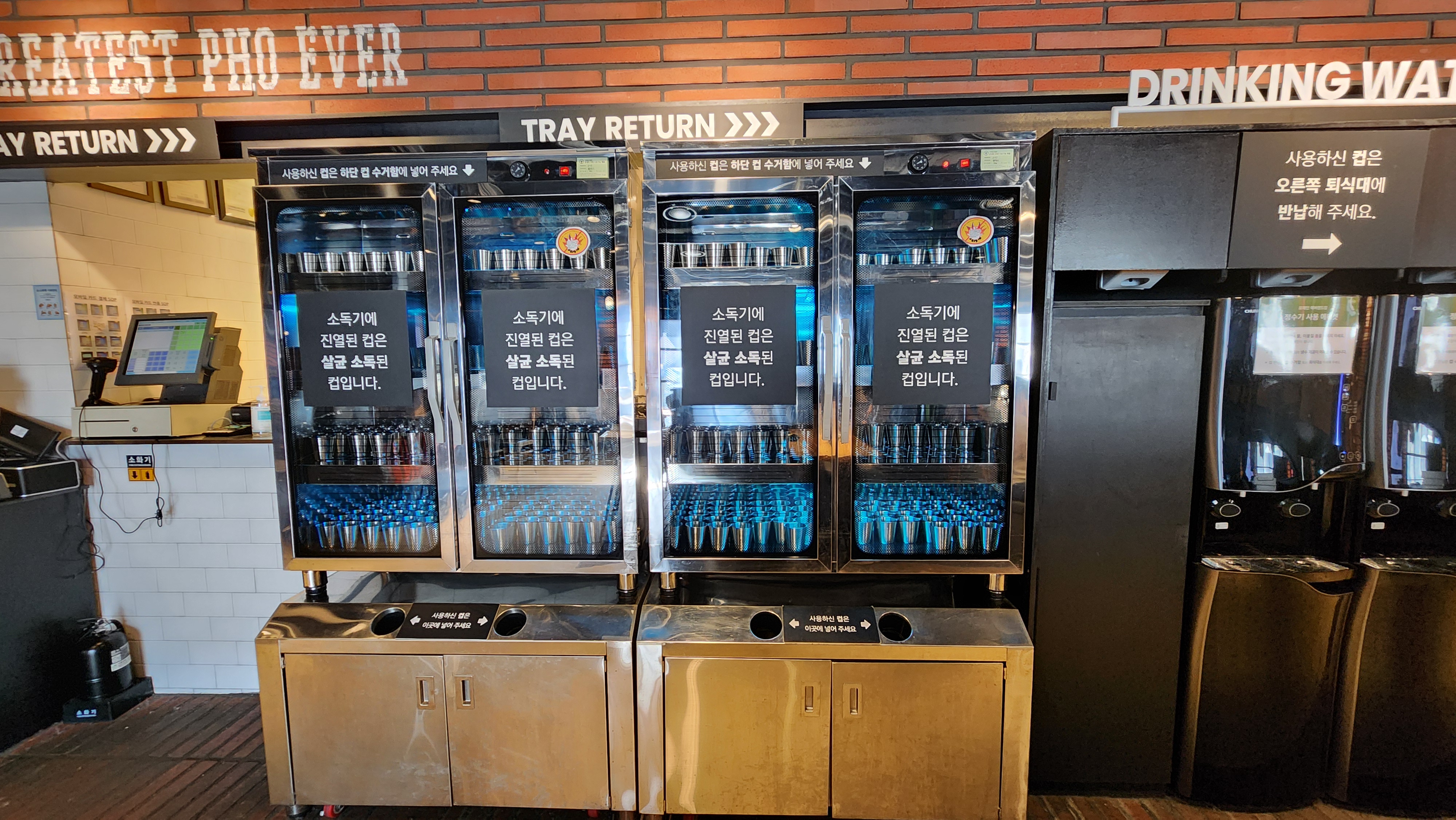 소독기에 컵이 비치되어있고 정수기도 있었어요.