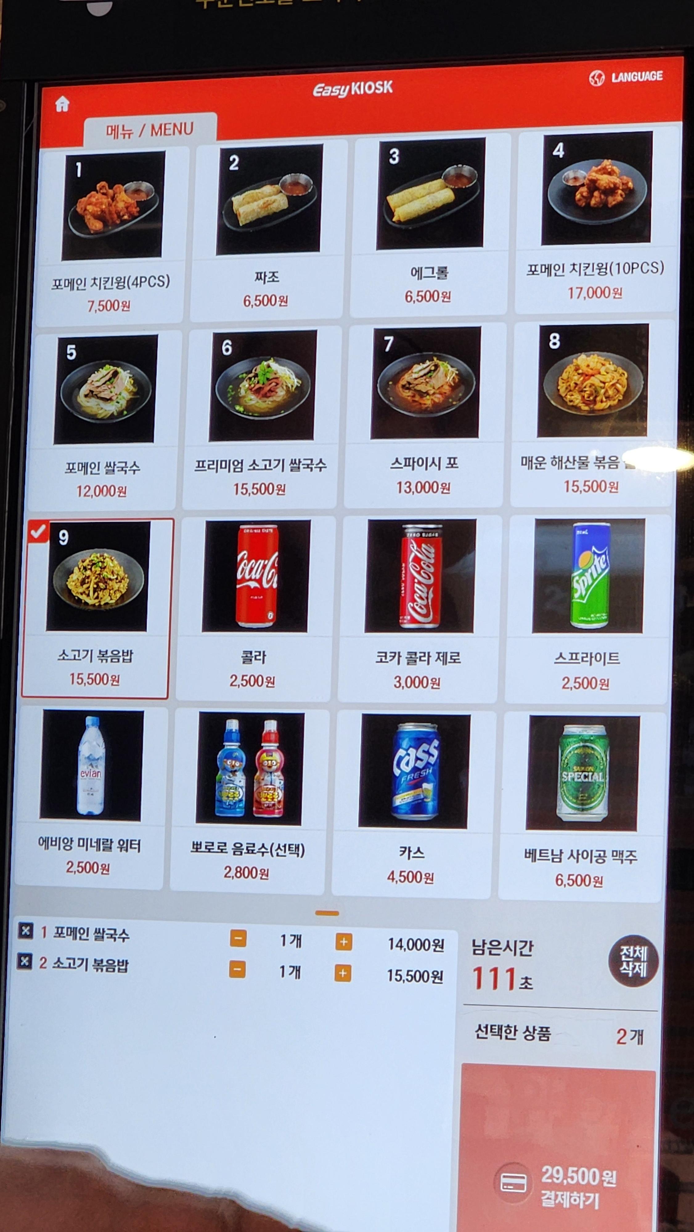 콜라랑 뽀로로음료에 쌀국수와 볶음밥을 주문했어요.