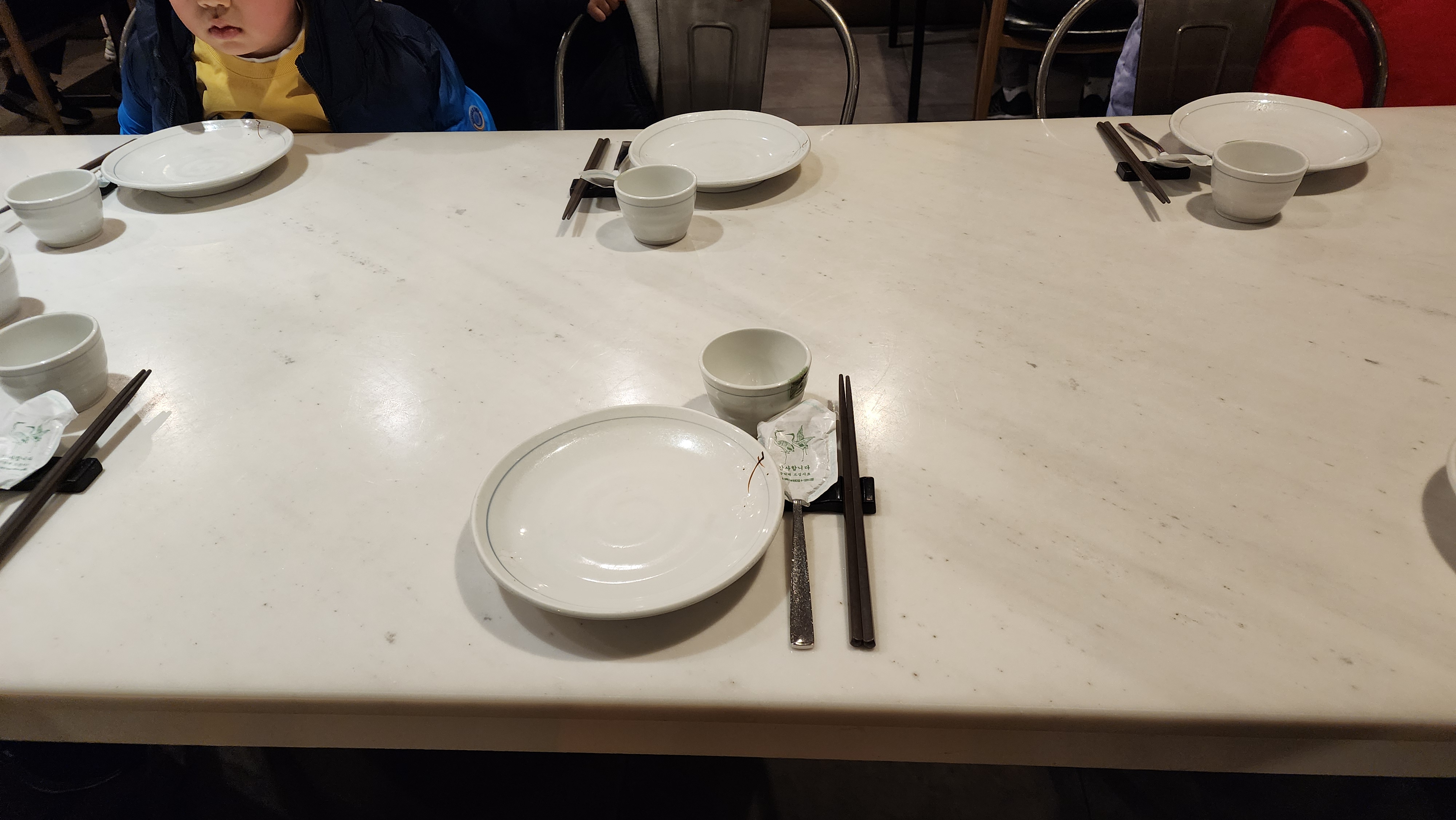 앞접시, 컵, 수저, 젓가락이 미리 셋팅되어 있었어요.