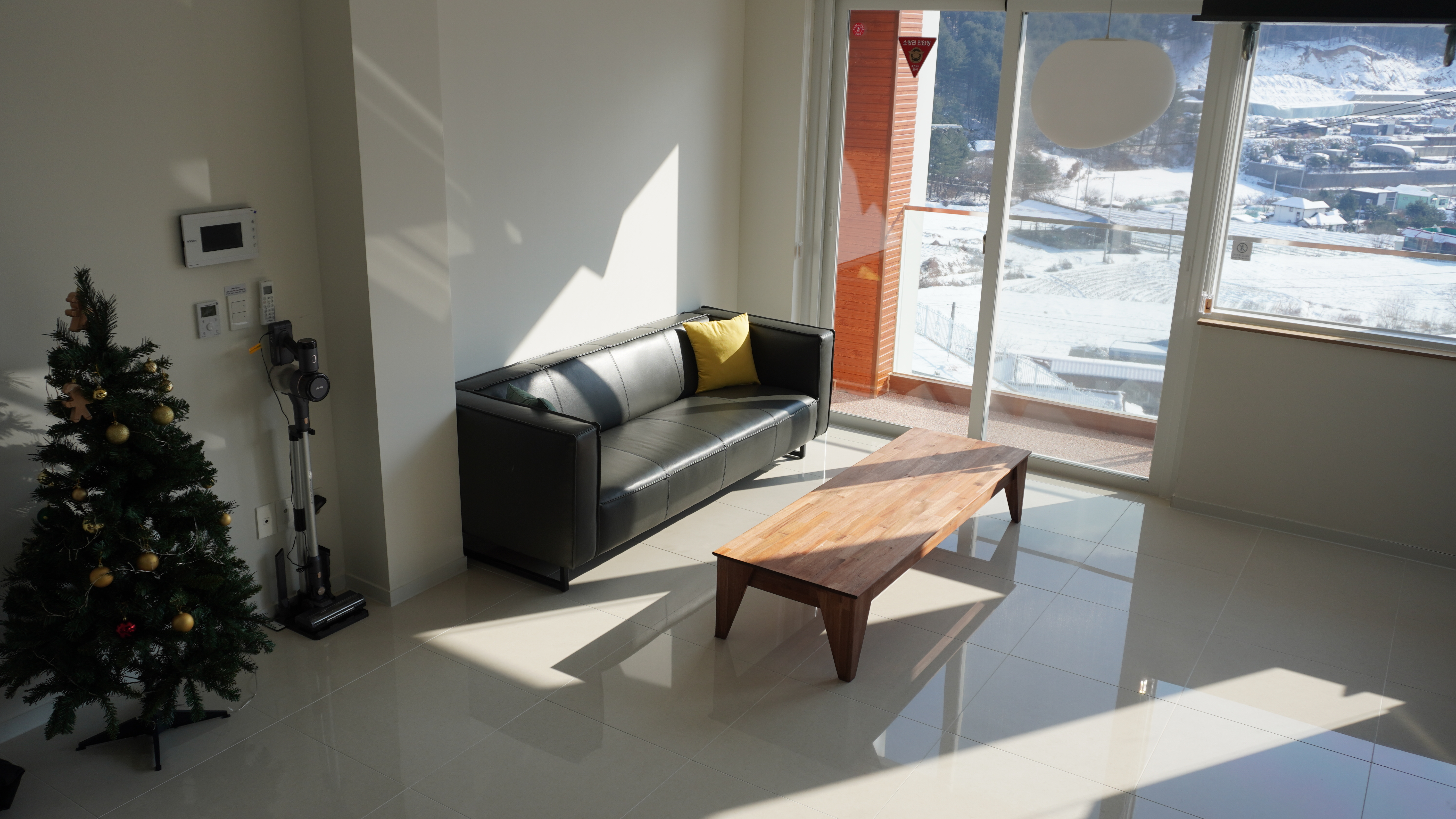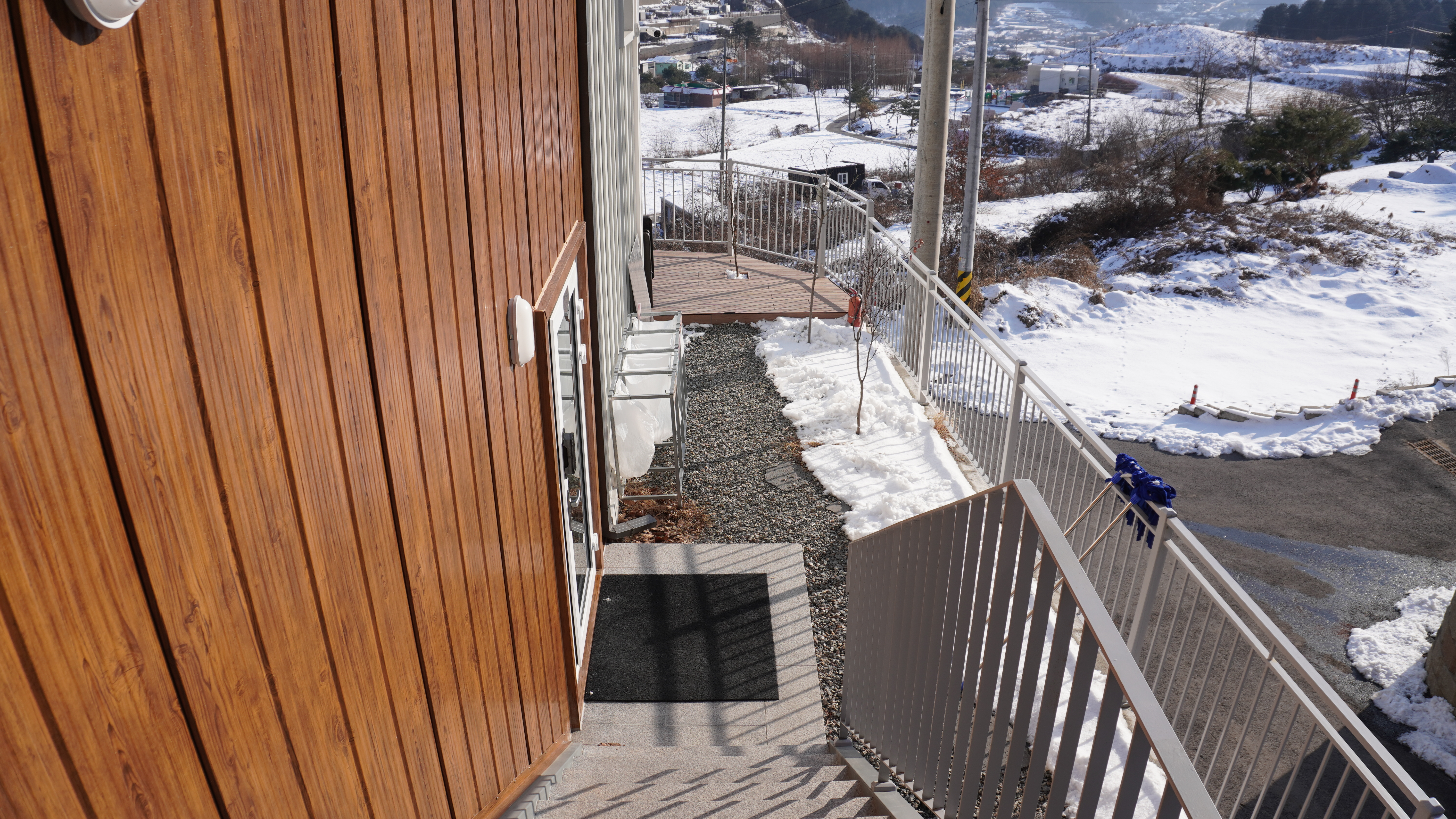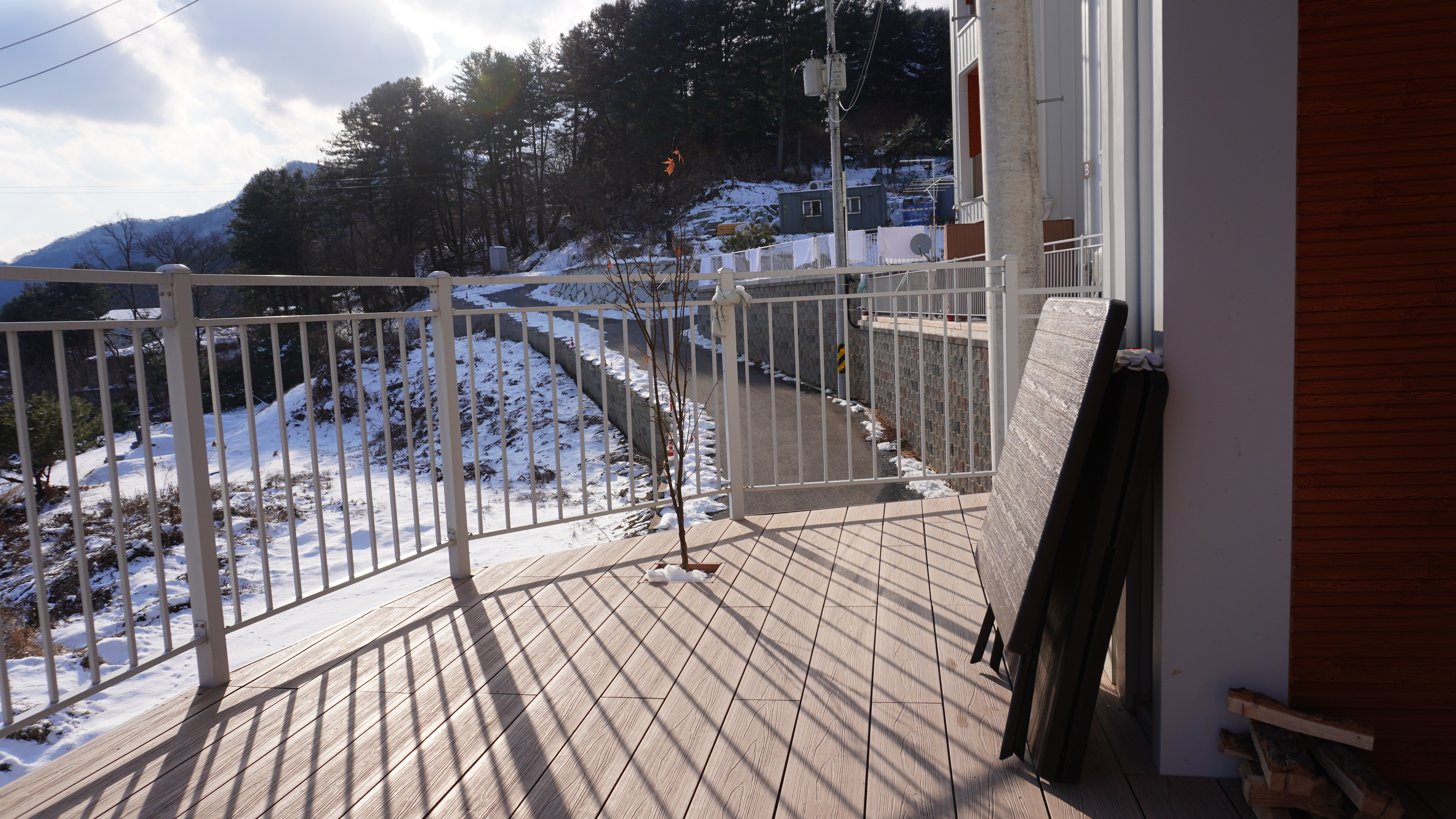 눈이 하얗게 덮인 가평이 멋졌고, 앞 테라스도 근사했어요.