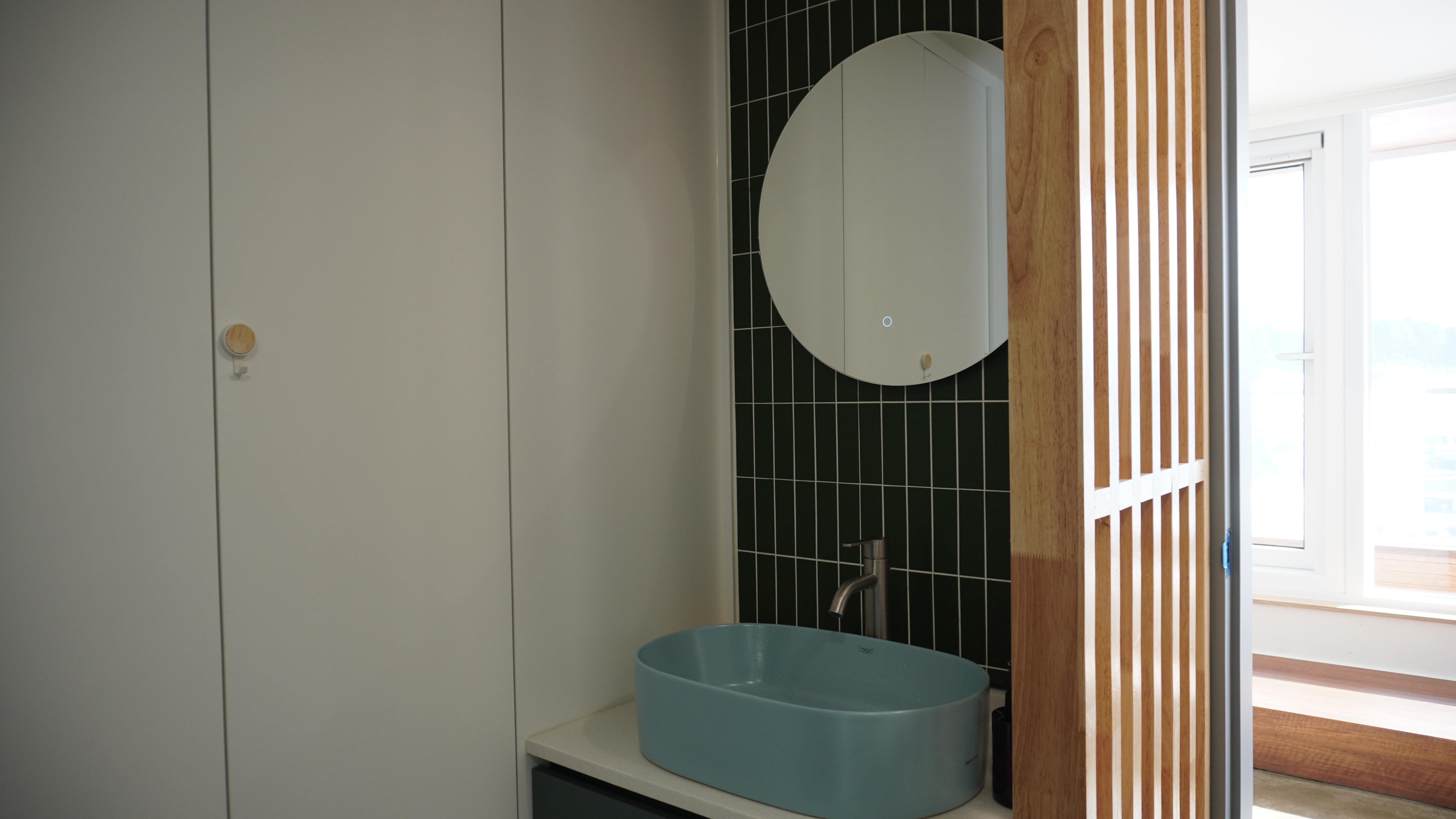 바닥재 색상을 바다에 온 것 처럼 써서 정말 탁 트인 느낌이 들더라구요.