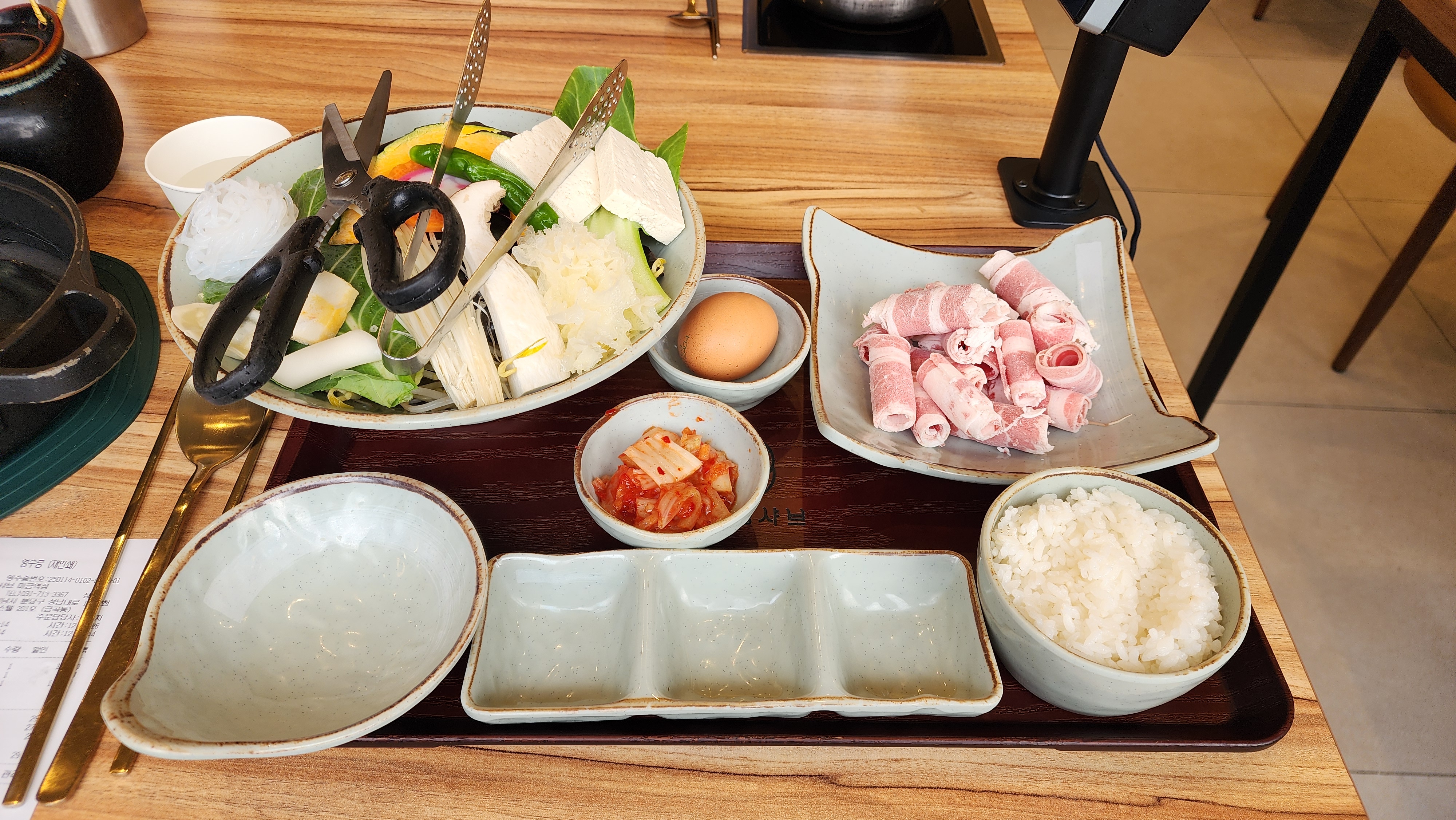 스키야키는 무쇠팬에 야채, 날계란, 우삼겹, 김치, 밥 구성으로 나왔어요.