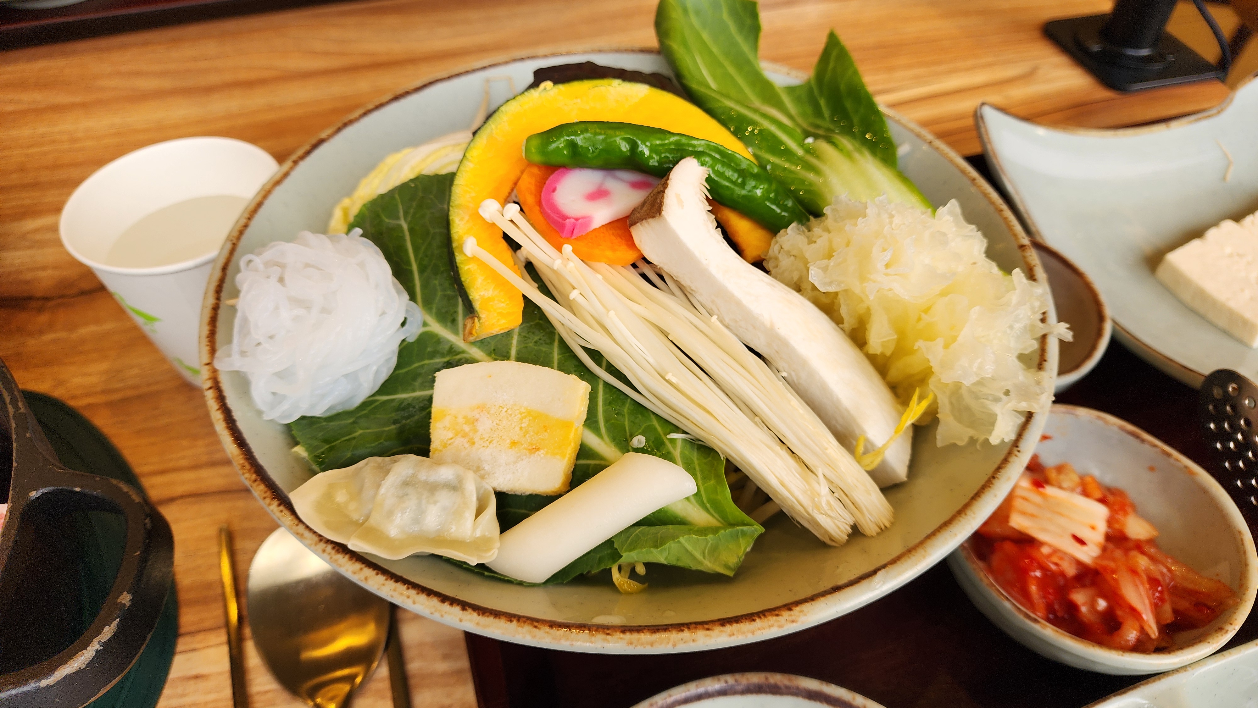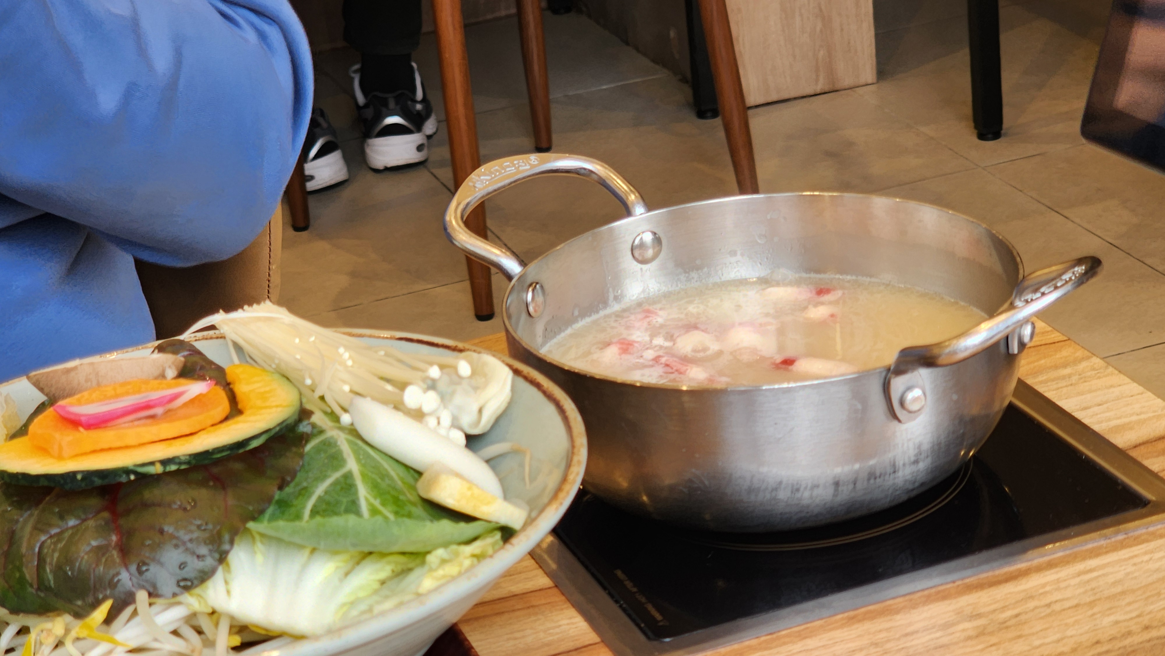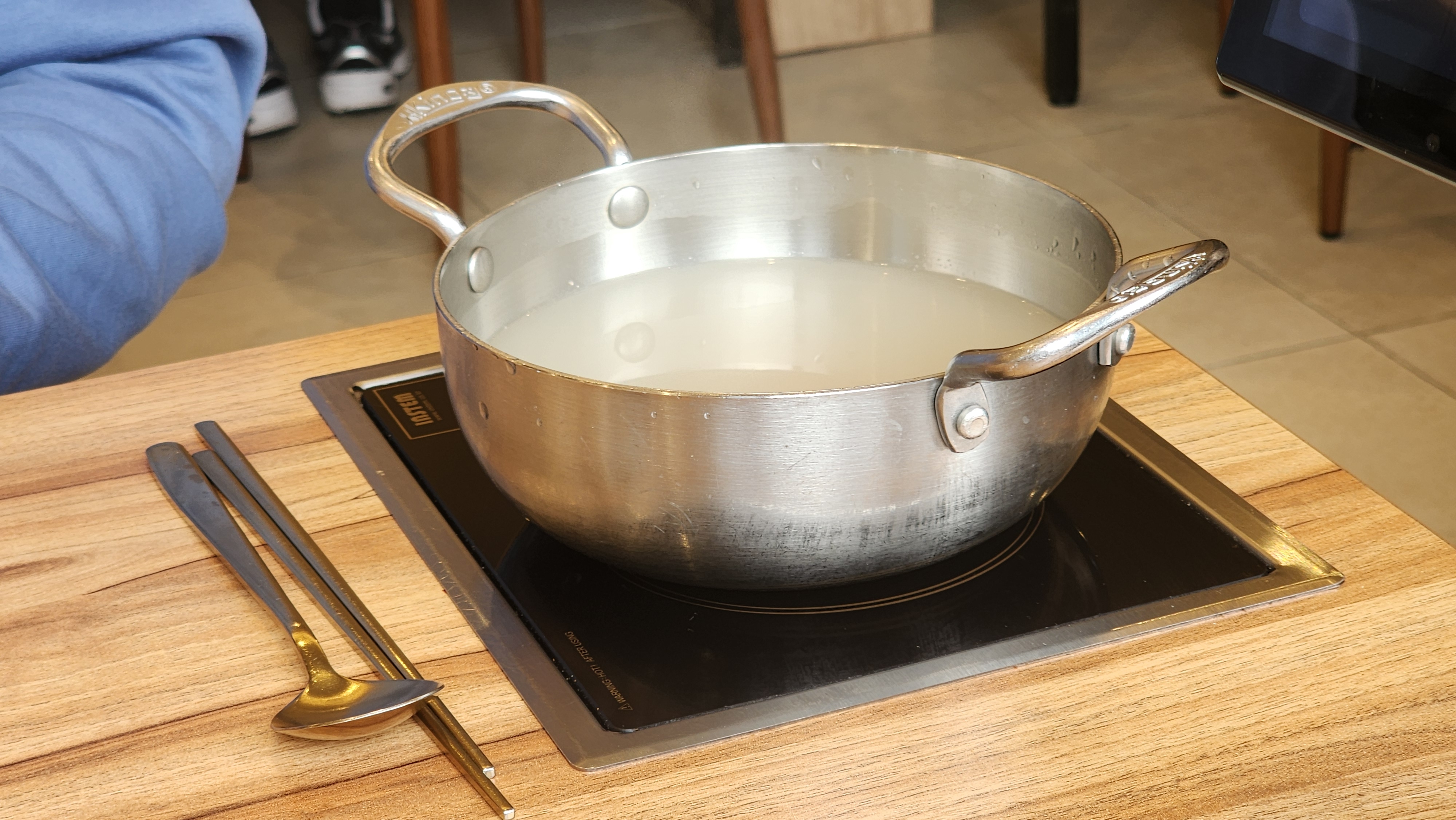 사골육수는 냄비에 담겨 나오는데 인덕션에 끓여야 하고, 육수가 끓으면 야채를 넣어 끓여야 하는데 기호에 맞게 드시면 될 것 같아요.