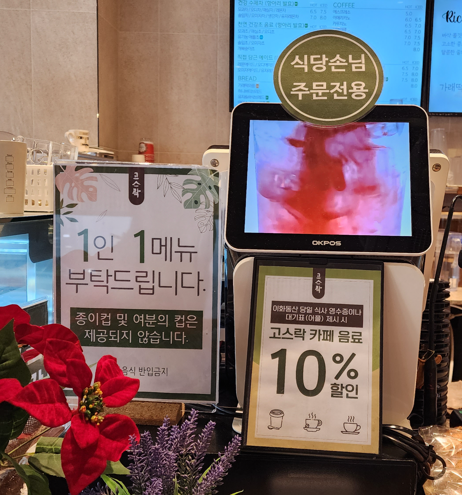 일반손님은 키오스크로 주문하지만 이화동산 식당 이용시 10% 할인을 받을 수 있는데 할인 받아서 주문하려면 카운터에 주문해야해요.