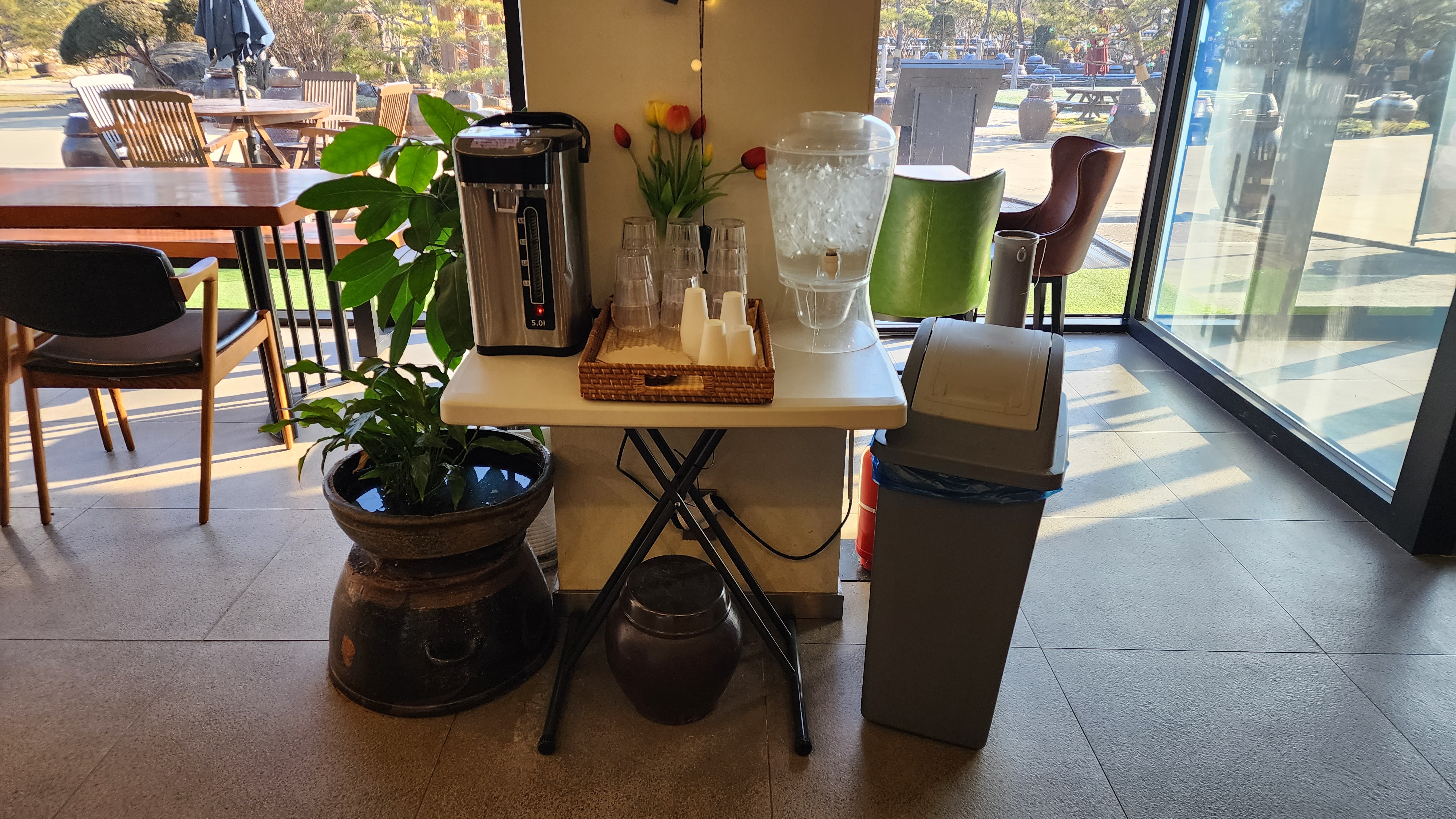 컵이나 냅킨, 물이 준비되어 있었는데 따뜻한 물이 담긴 보온 주전자가 있어서 좋더라구요.