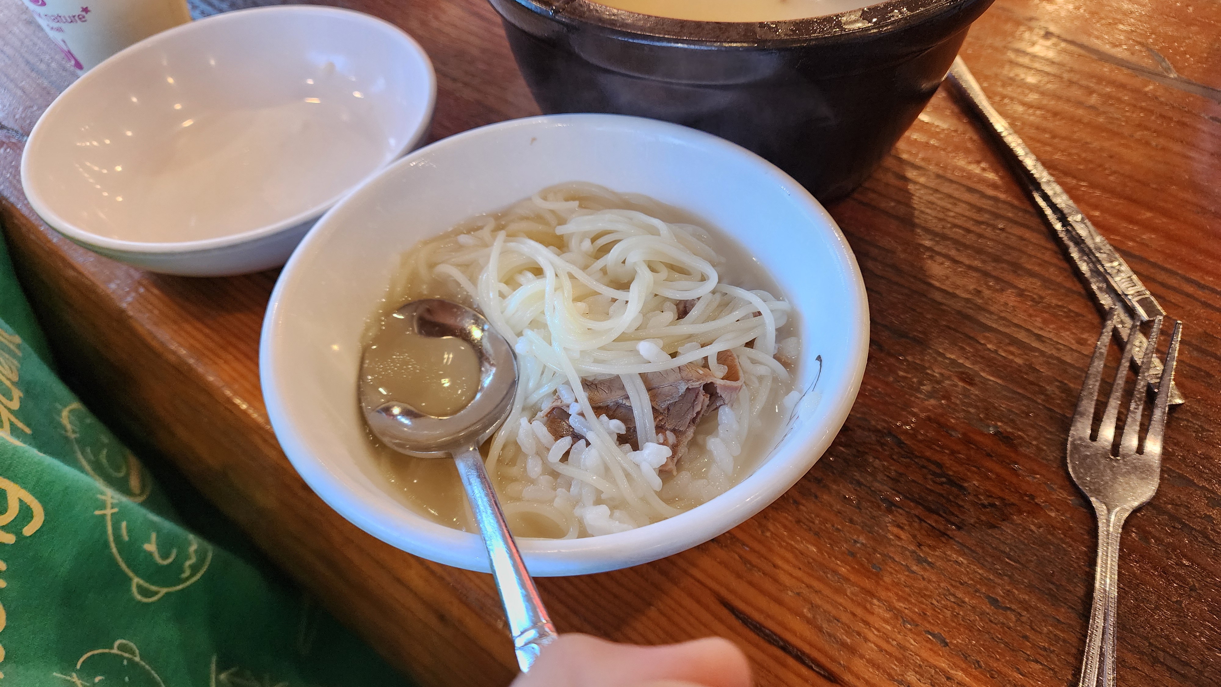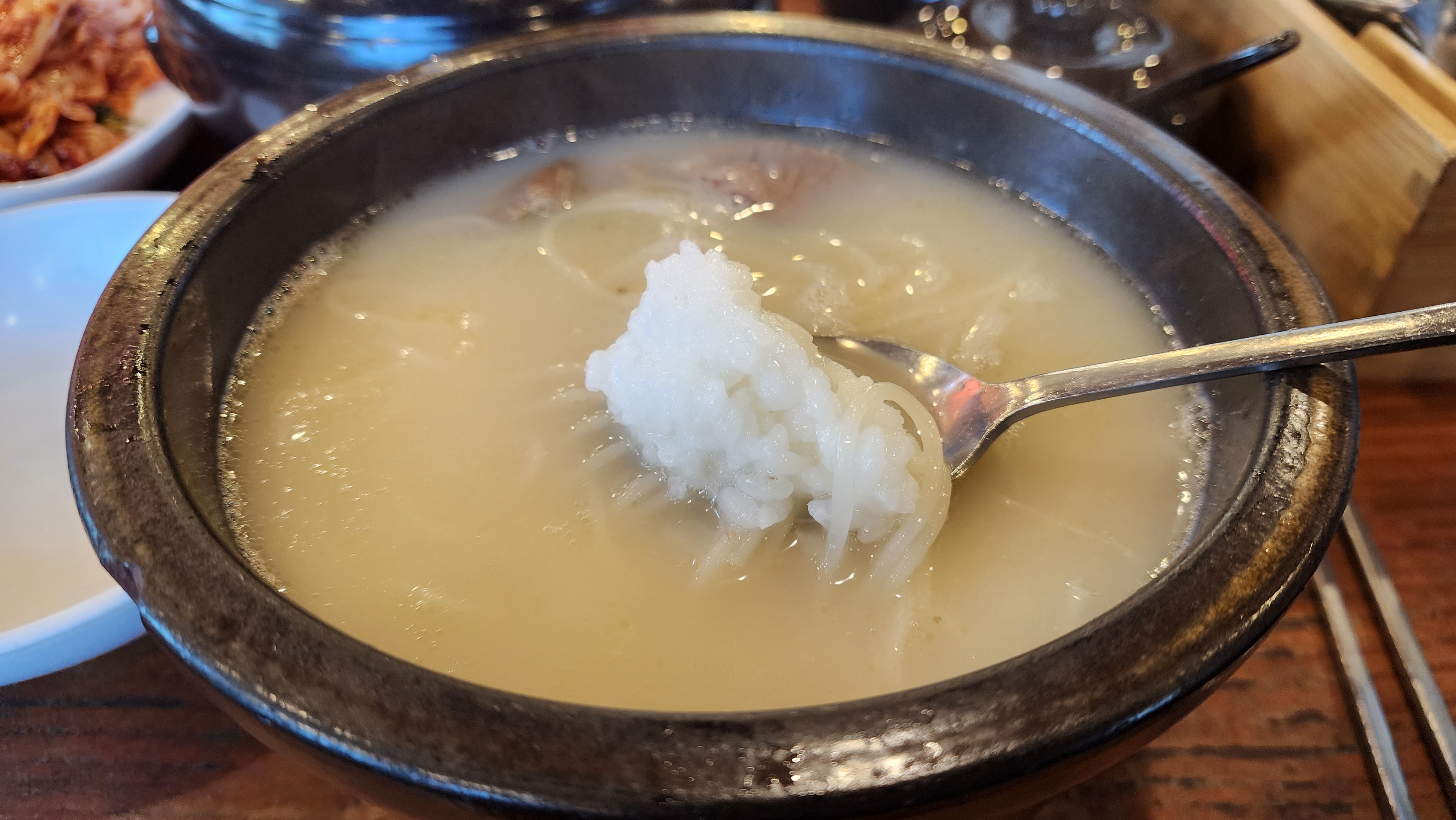 두툼한 도자기 그릇에 설렁탕이 나왔어요.