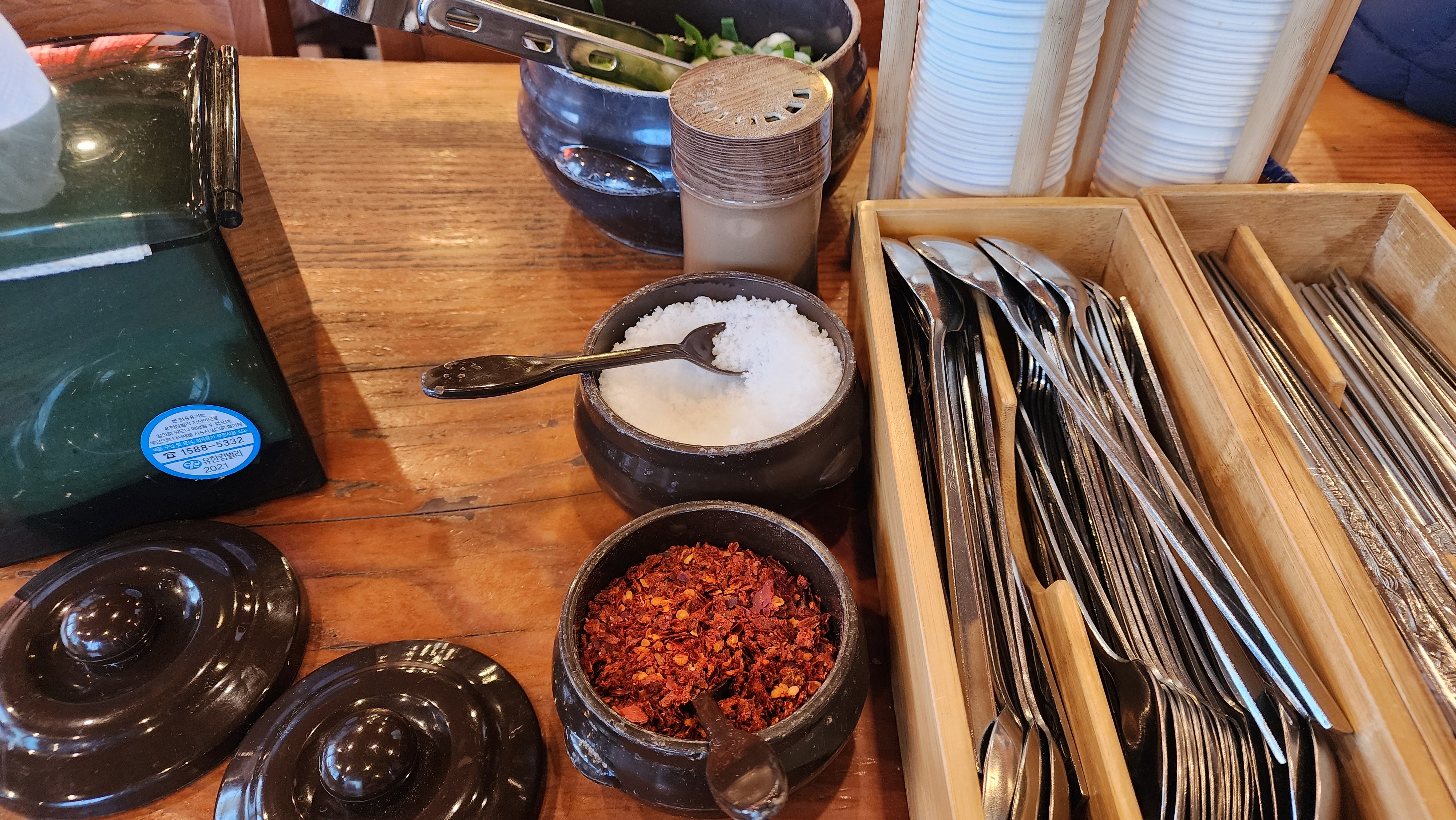 요리에 곁들여 먹을 파, 후추, 소금, 고춧가루도 놓여있었어요.