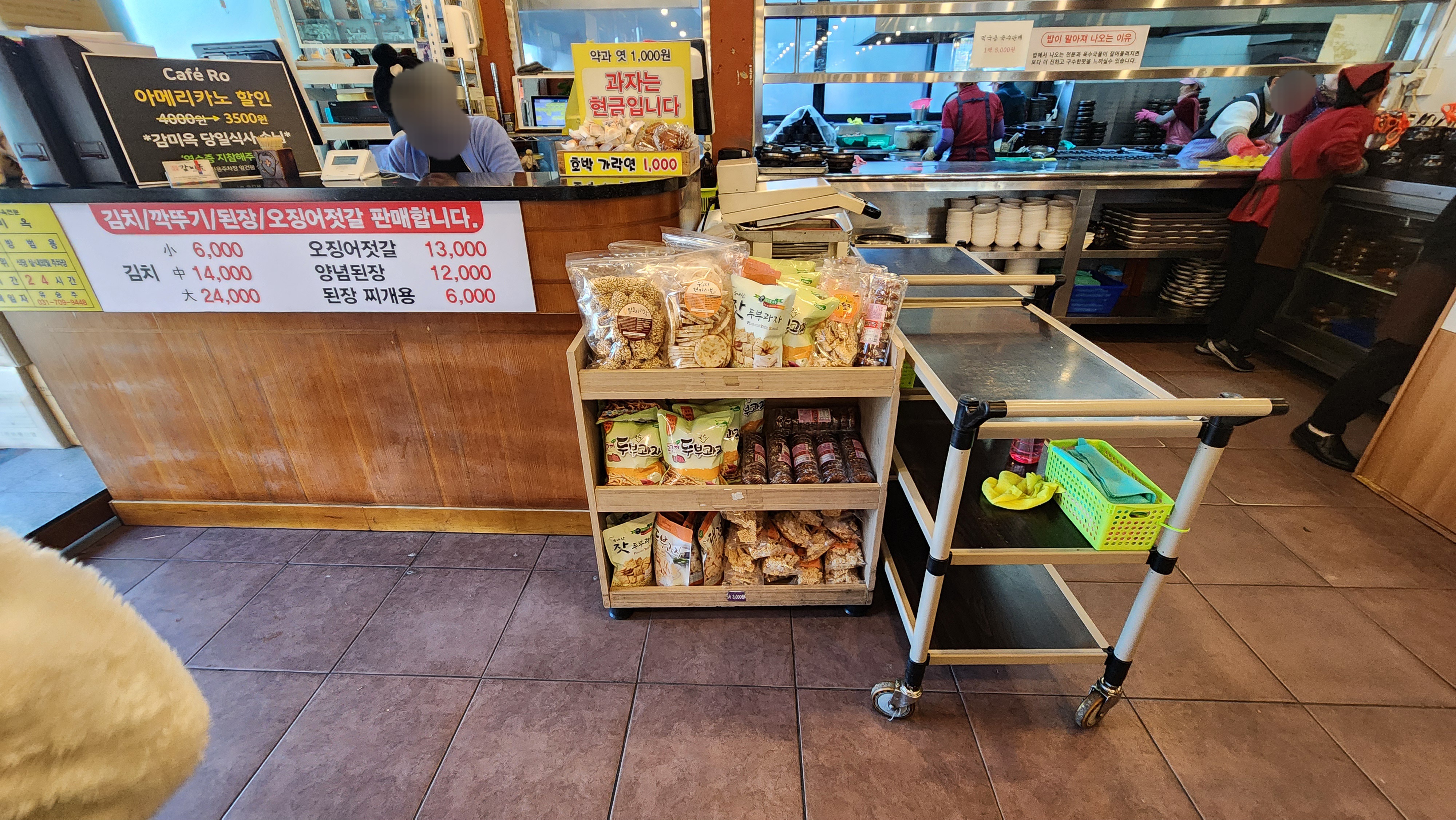카운터에는 민속과자 등이 판매되고 있었고 반찬이나 젓갈 판매 내용도 안내되어있었어요.