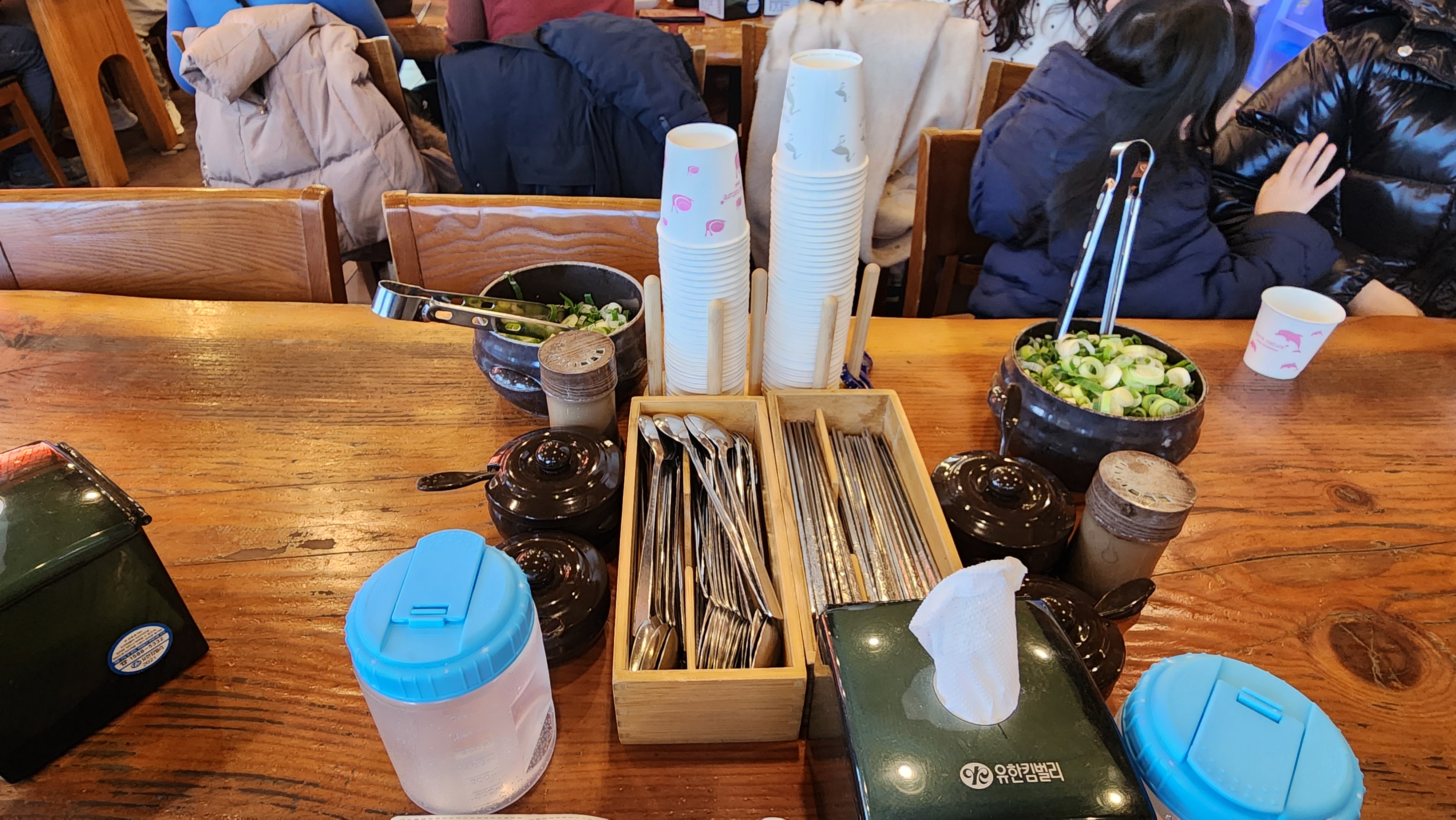 자리에 앉으니 물을 가져다 주셨고 테이블 위에는 수저, 젓가락, 냅킨, 종이컵 등이 놓여있었어요.