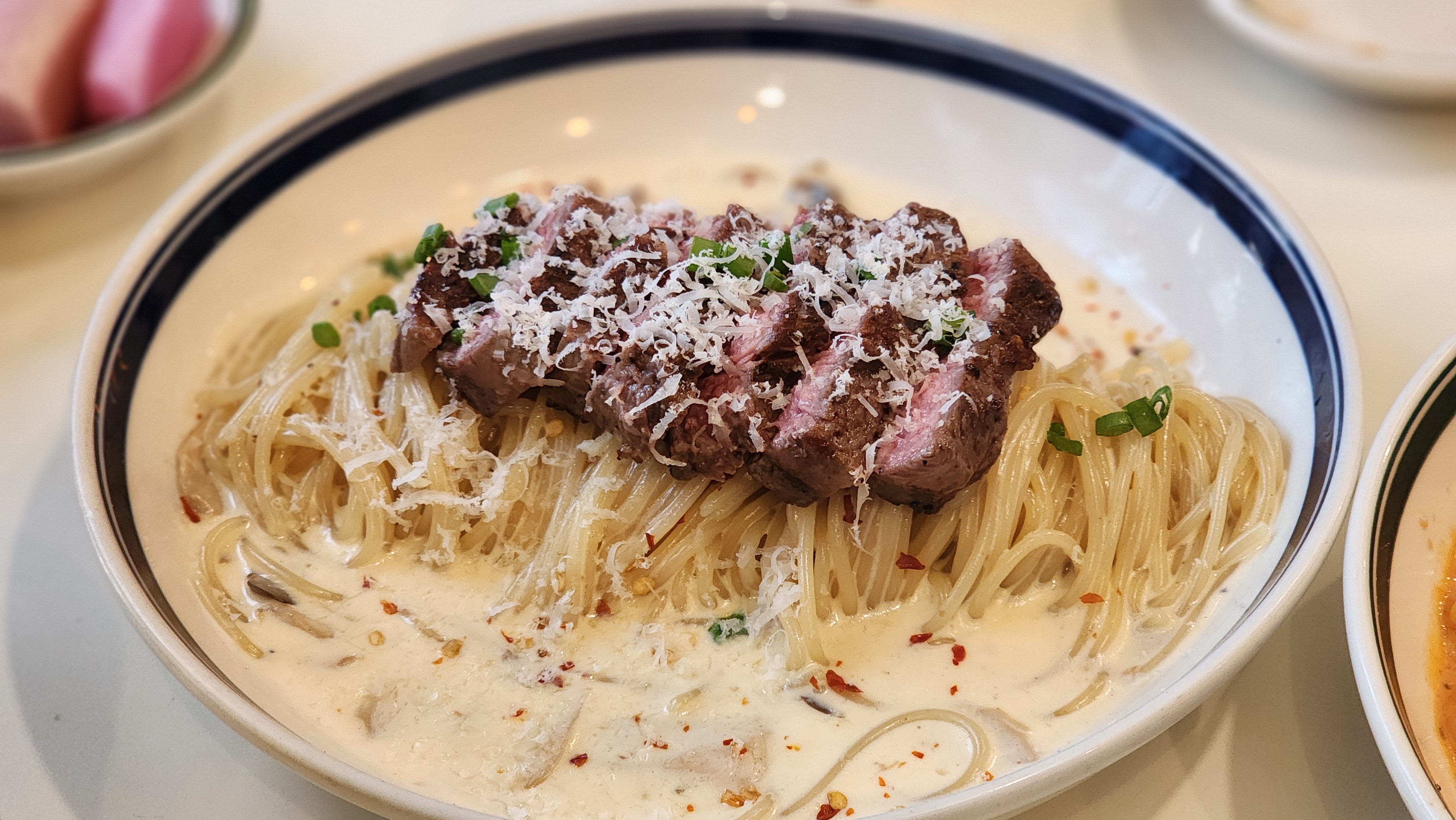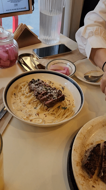 스테이크가 크림파스타 위에 먹음직스럽게 얹어져 나오는데요 크림소스에서 살짝 매콤한 맛도 나서 많이 느끼하지 않았어요.