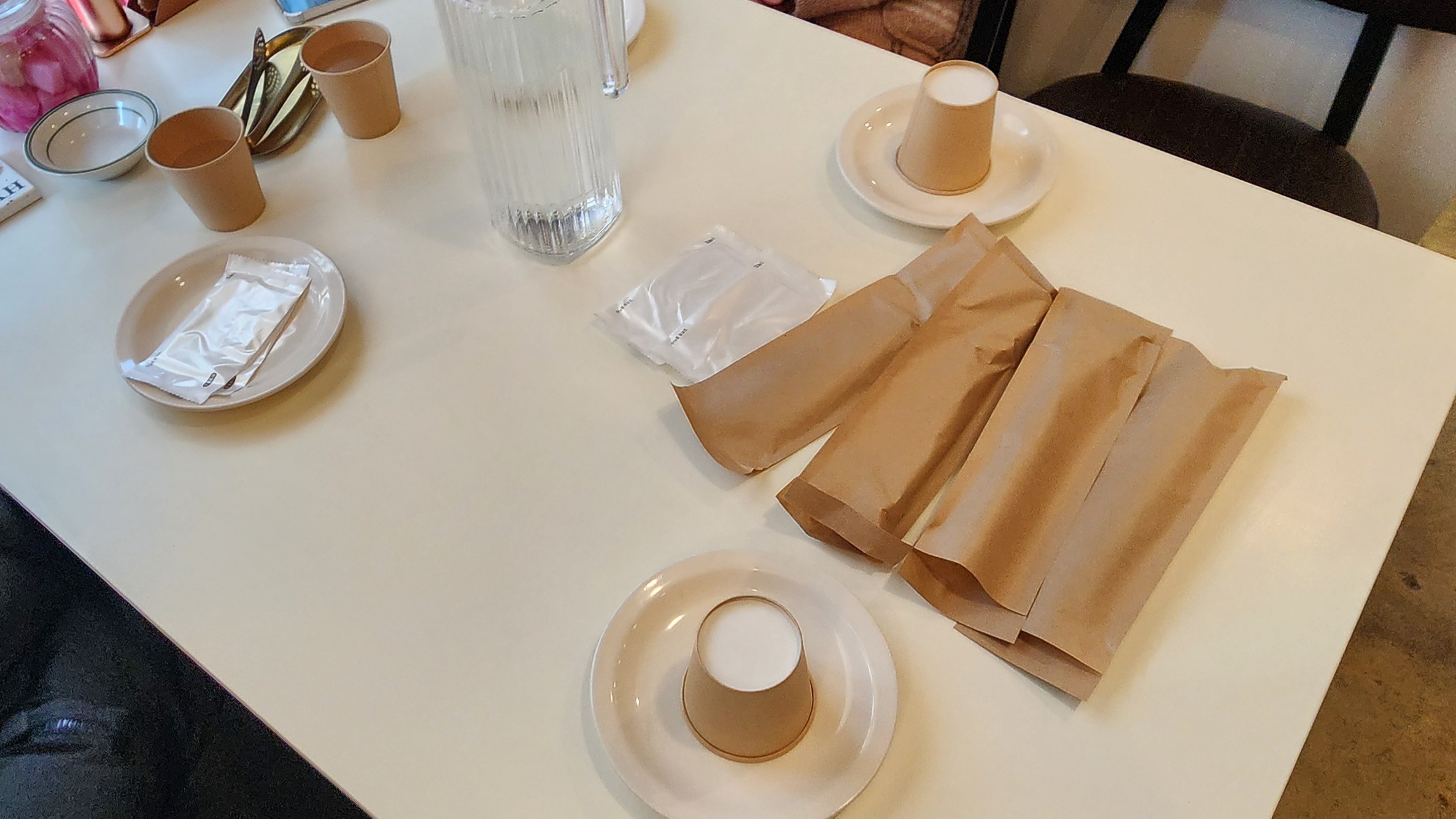 물과 식기도 가져다주셨고 종이컵을 사용했어요.