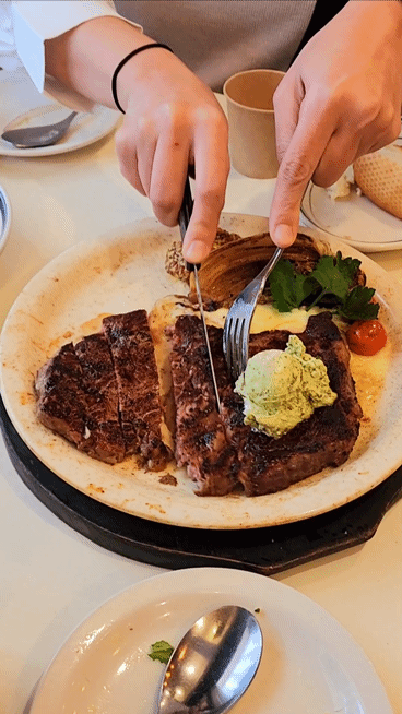 함께 나오는 바질버터도 감칠맛이 좋았는데요, 생각보다 고기가 좀 질겨서 칼질이 어려웠어요.