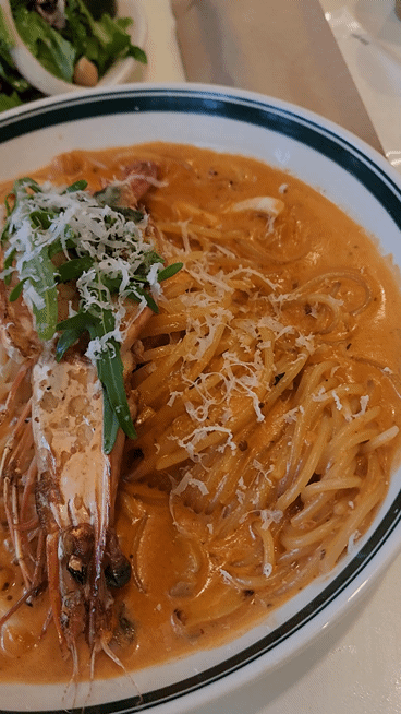 오징어 등 해산물이 곁들여진 로제파스타에 킹프라운이 턱 올라가있는 파스타였어요.