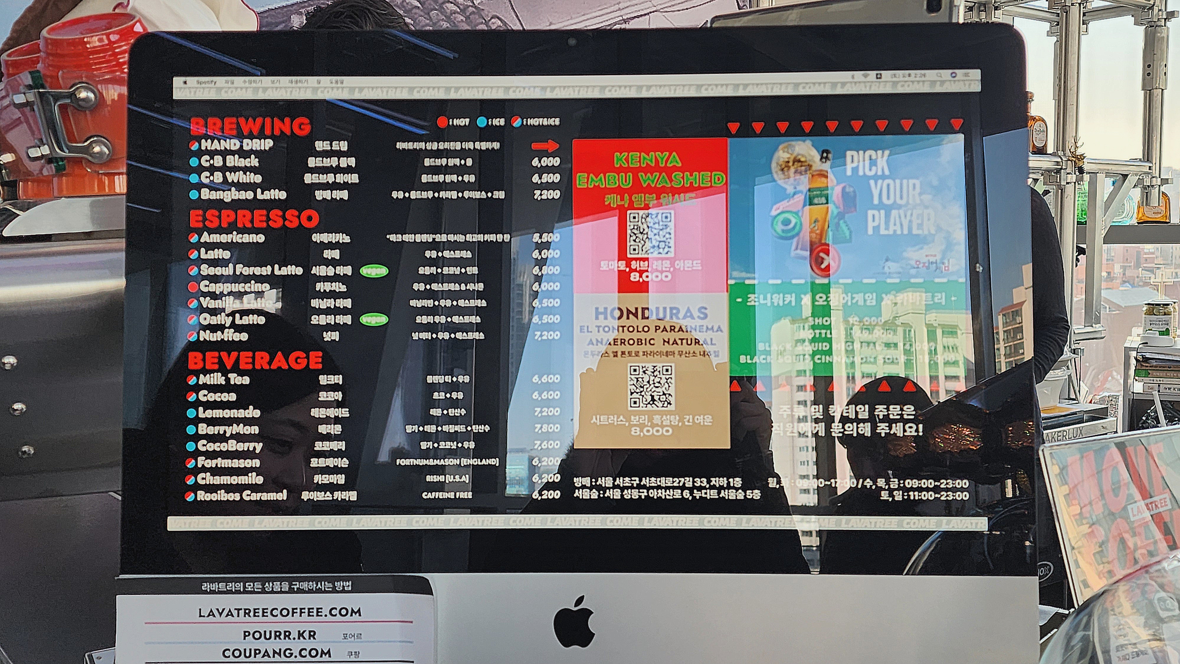 카페 메뉴도 외국 메뉴판 느낌이 나죠? 가격대는 조금 있는 편인데요 서울에서 이만한 뷰를 자랑하는 카페의 커피값이려니 생각하면 납득이 좀 되요.