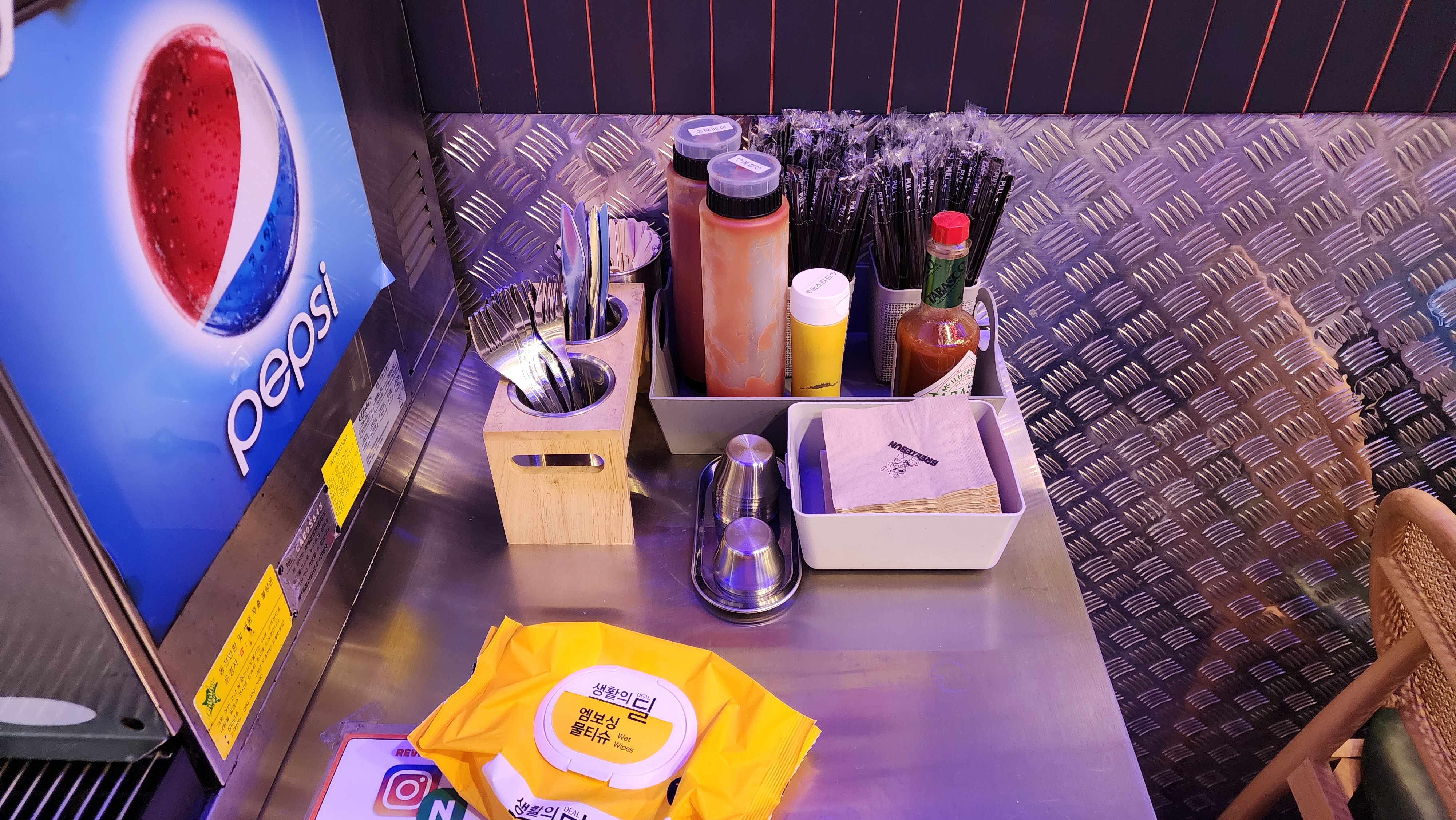 나이프, 포크, 빨대, 소스, 소스그릇, 냅킨, 물티슈 등은 필요한 만큼 가져다 쓸 수 있도록 되어 있었고요.