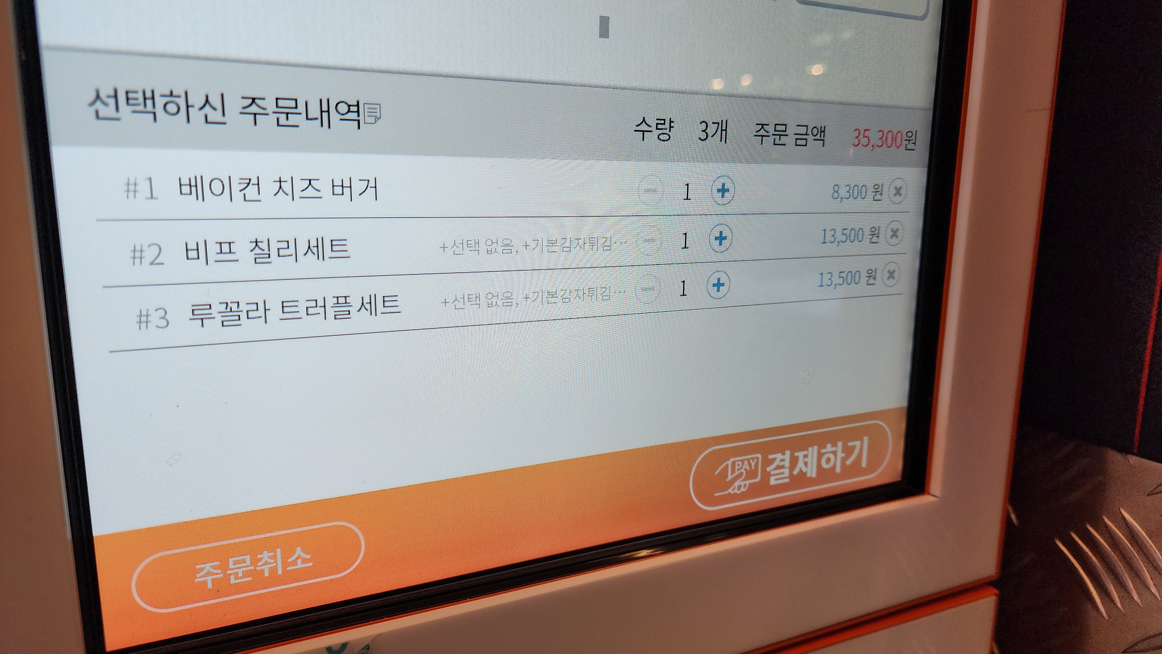 베이컨치즈버거, 비프칠리세트, 루꼴라트러플세트를 주문했어요.