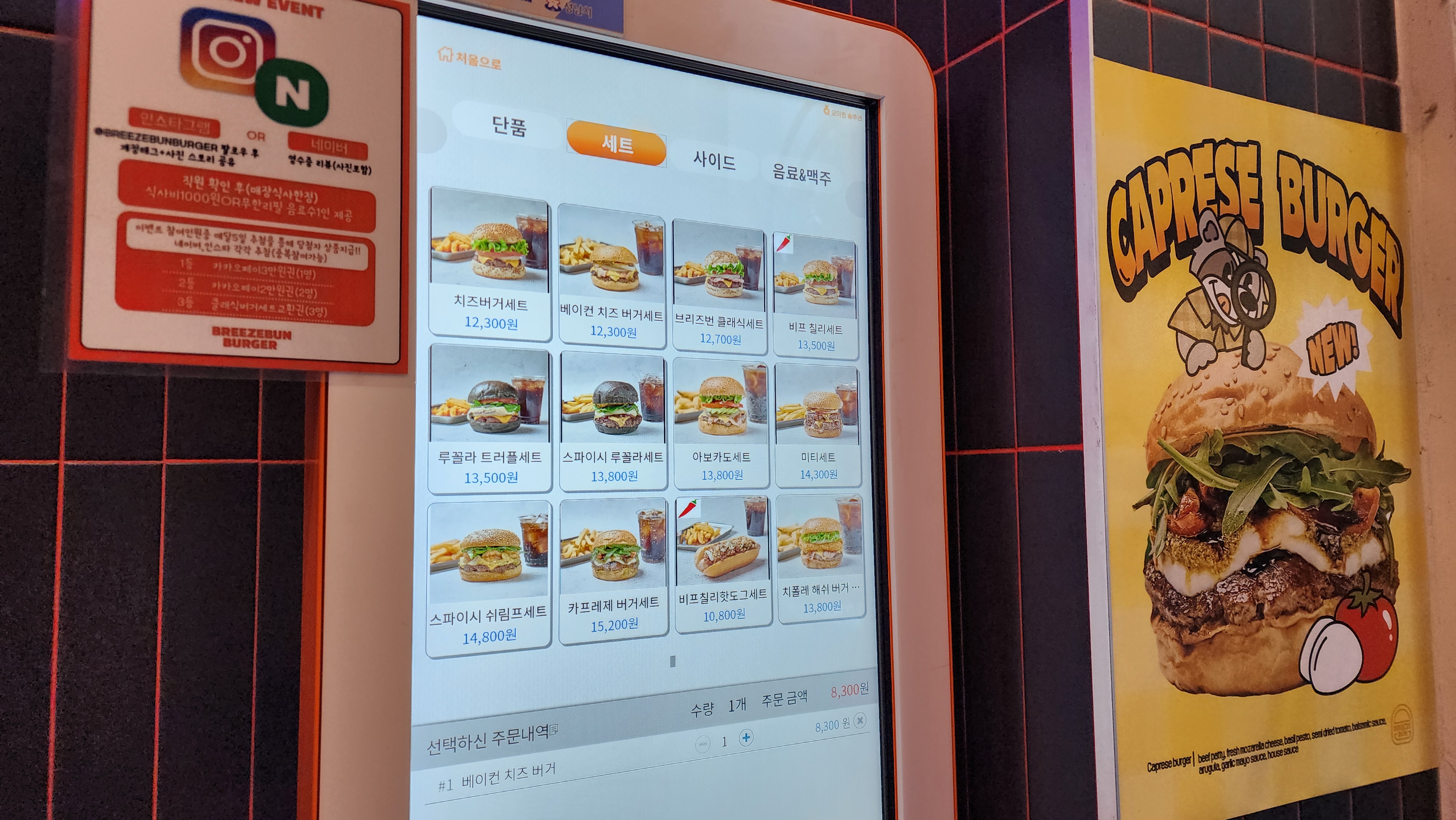 키오스크가 있어서 매장에서 식사할지 포장할지 선택할 수 있었는데요 저희는 매장식사 선택했어요.