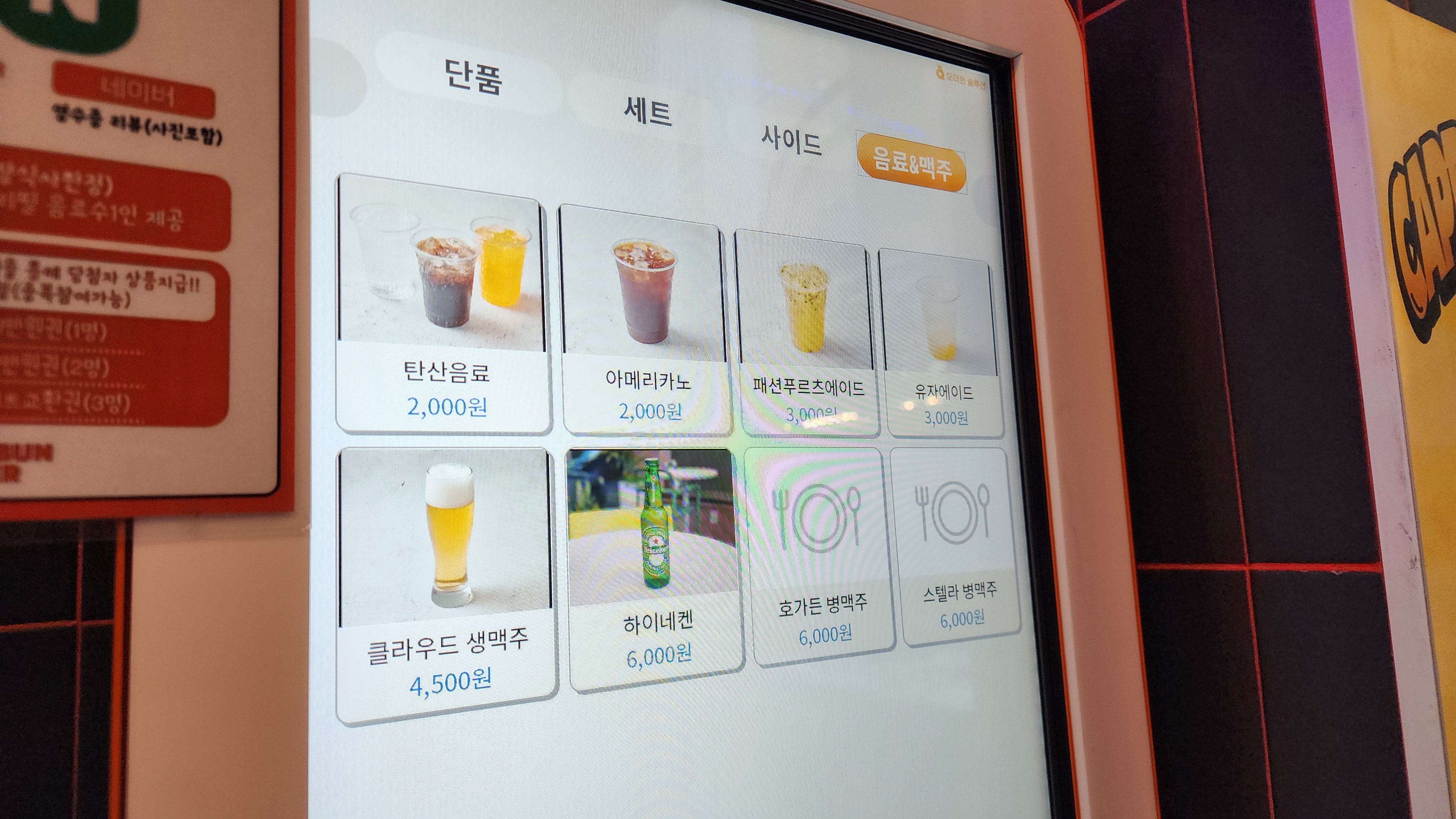 탄산음료, 아메리카노, 에이드, 맥주 메뉴가 있었는데요 애석하게도 저희집 어린이는 탄산을 못마시거든요.