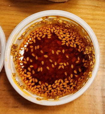 약간 빨간 기름인거 보니 고추기름인가 싶기도 하고 향이 독특한데 족발과 잘 어울리고 소금이 아래 가라앉아 있어서 섞어서 찍어먹으면 간도 잘 잡아주더라구요.