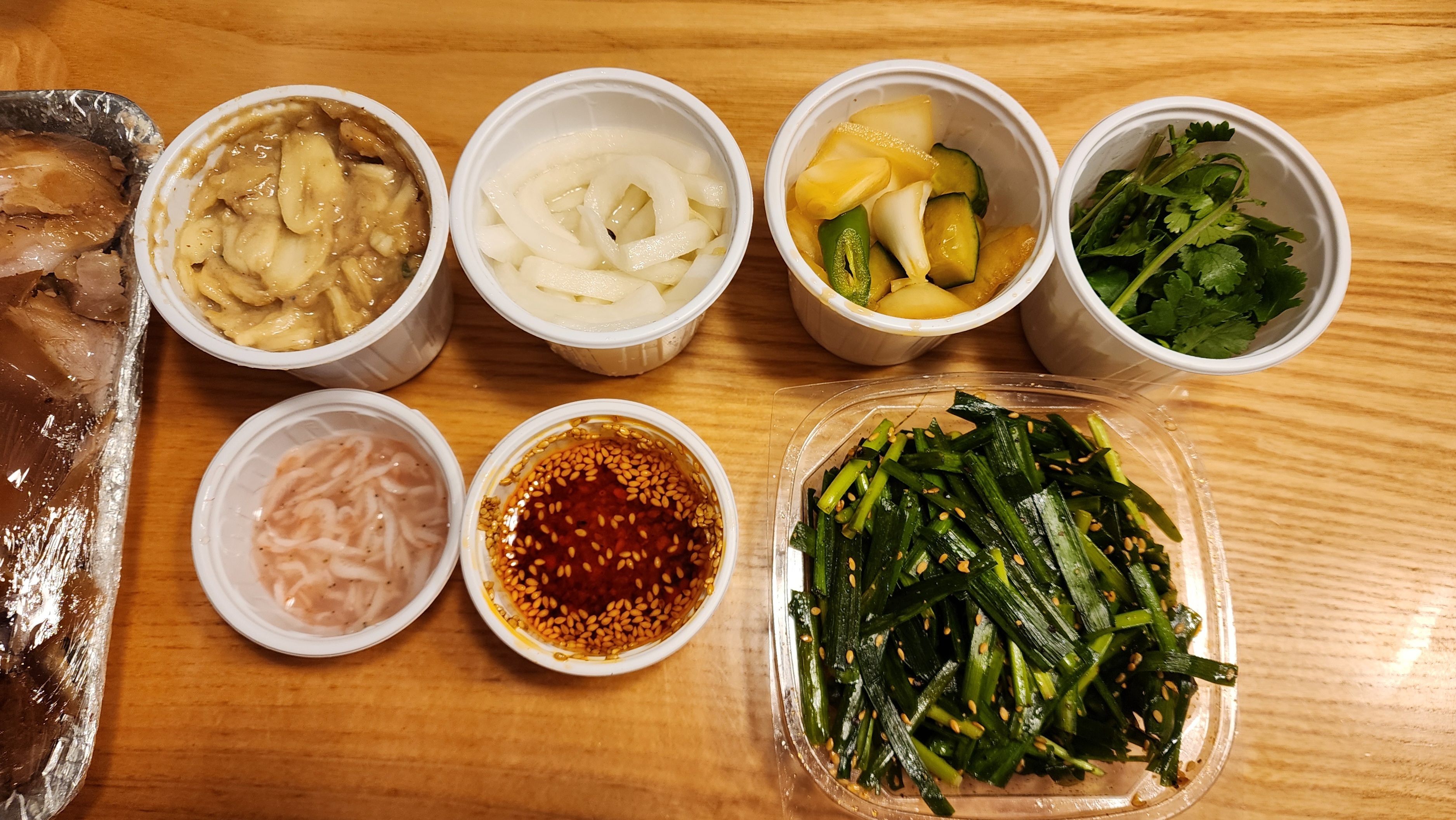 쌈장, 하얀무김치, 양파고추간장피클, 고수, 새우젓, 고추기름(소금), 부추무침이 들어있었어요.