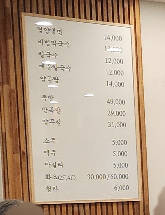 홀에서 주문 가능한 메뉴는 평양냉면, 비빔막국수, 칼국수, 매운칼국수, 양곰탕, 족발, 반족발, 양무침, 소주, 맥주, 막걸리, 화요, 청하이고요