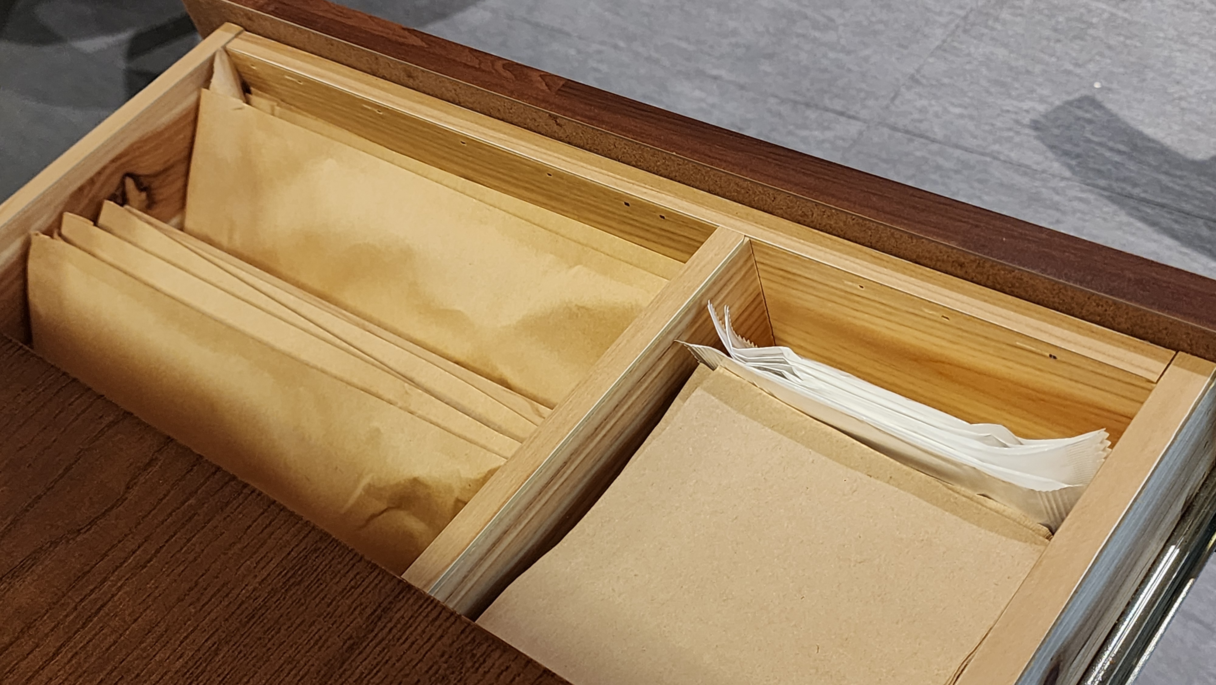 서랍을 열면 수저와 젓가락은 봉투에 들어있었고 마실 물과 컵, 그리고 솥밥 누룽지에 넣을 뜨거운 물을 주셨어요.