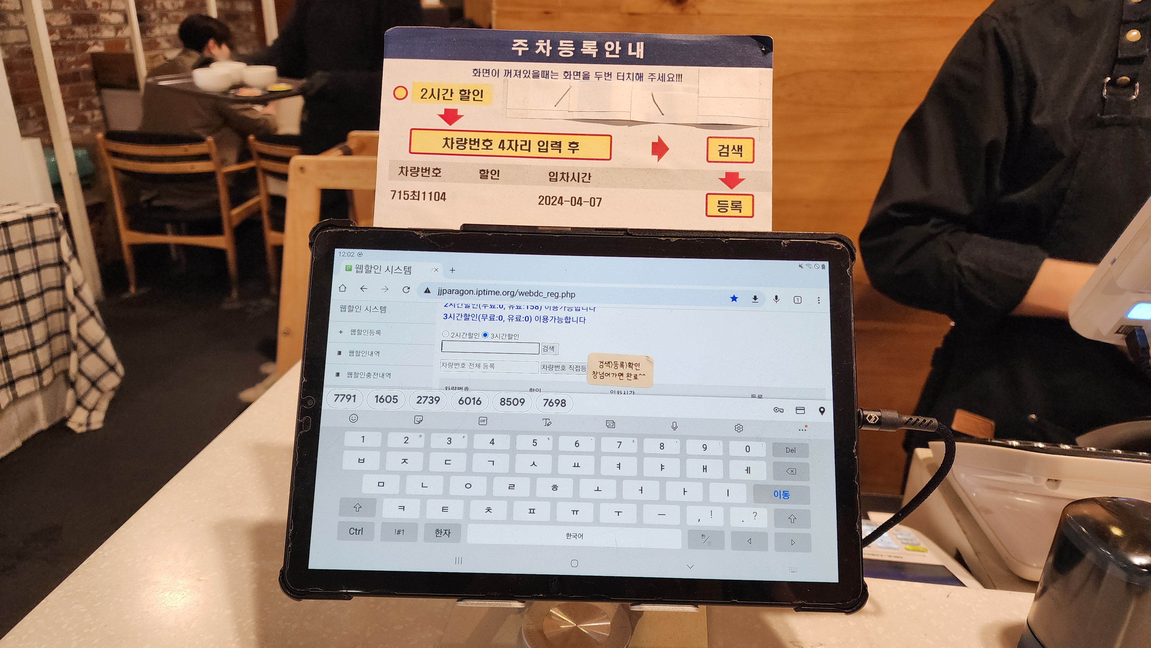 식사 끝나고 카운터에서 계산할 때 주차 말씀드리면 태블릿으로 등록해도 되고 직원분이 해주시기도 하더라구요.