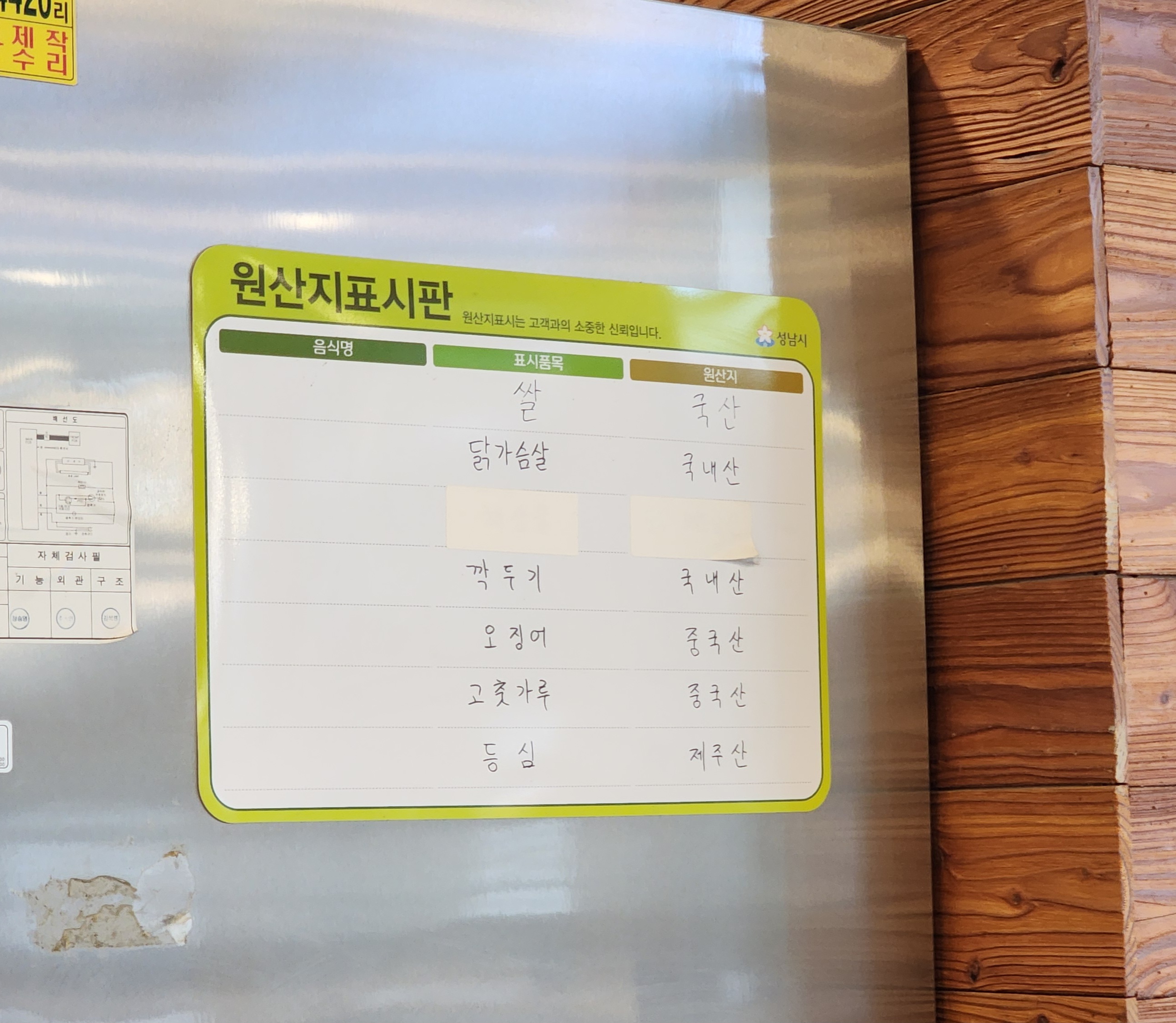 쌀, 닭가슴살, 깍두기는 국내산이었고 오징어와 고추가루는 중국산, 등심은 제주산이었어요.