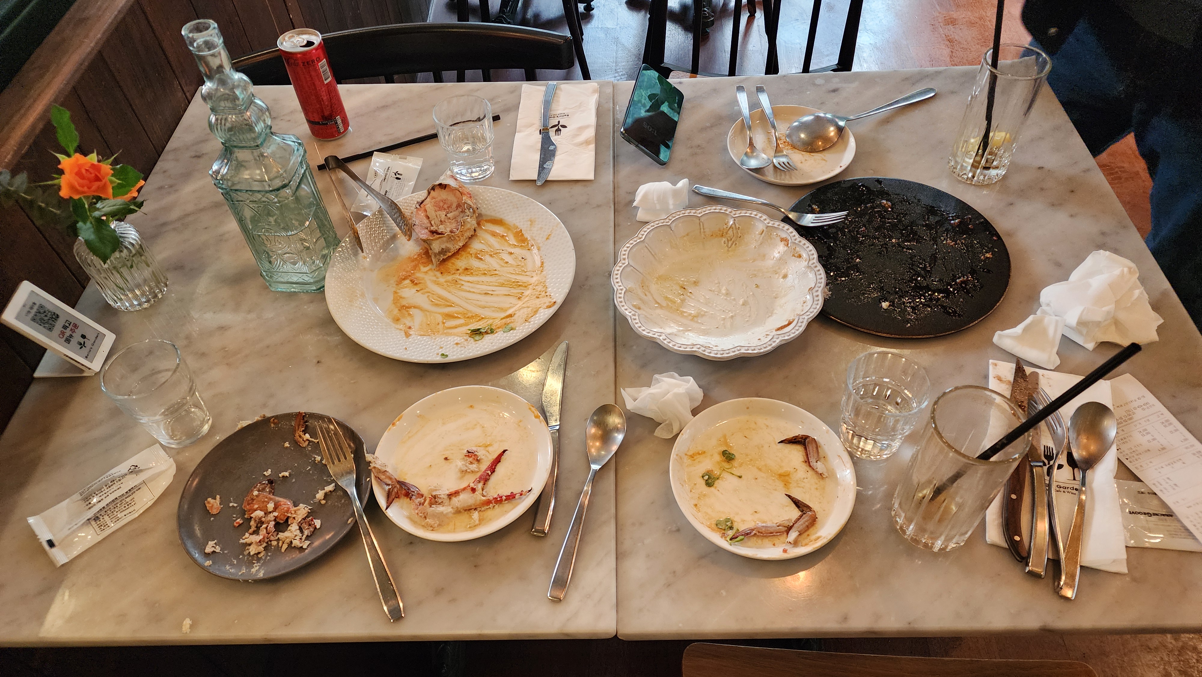 예쁜 유리 물병에 물도 가져다 주셨고 식기와 물티슈, 컵이 놓여있었고 음료는 제로콜라와 아메리카노(리뷰이벤트 참여)도 마셨어요.