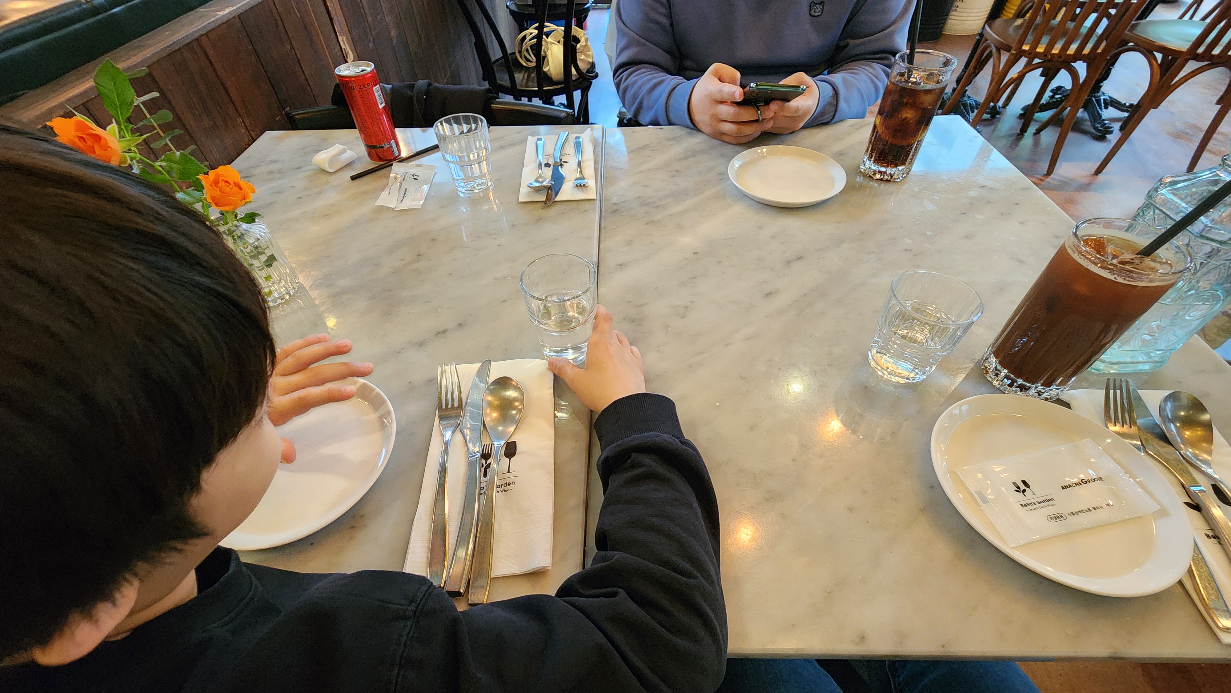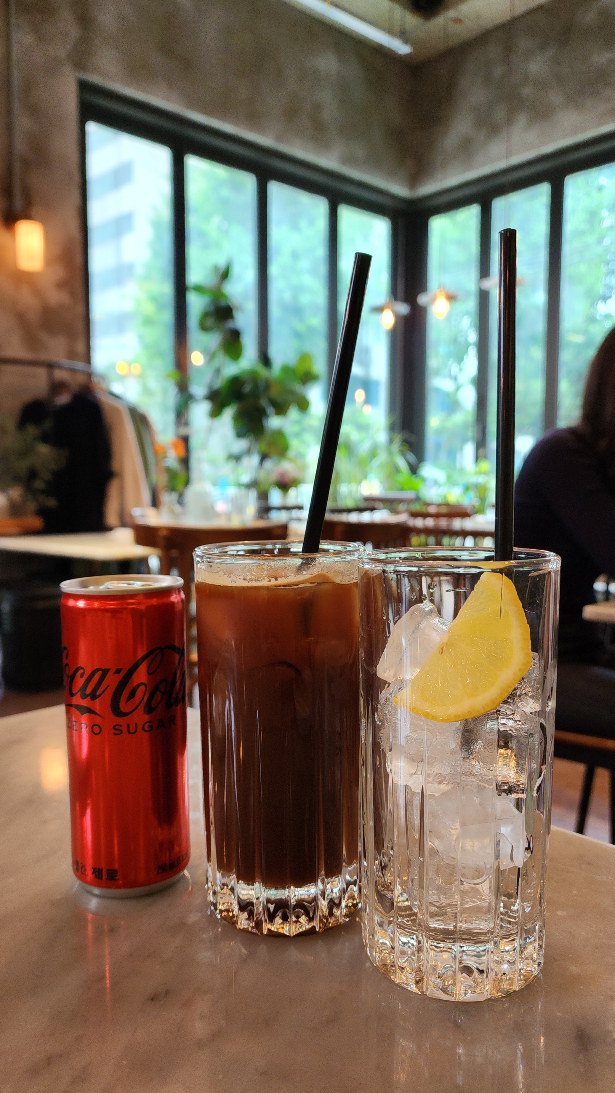 예쁜 유리 물병에 물도 가져다 주셨고 식기와 물티슈, 컵이 놓여있었고 음료는 제로콜라와 아메리카노(리뷰이벤트 참여)도 마셨어요.