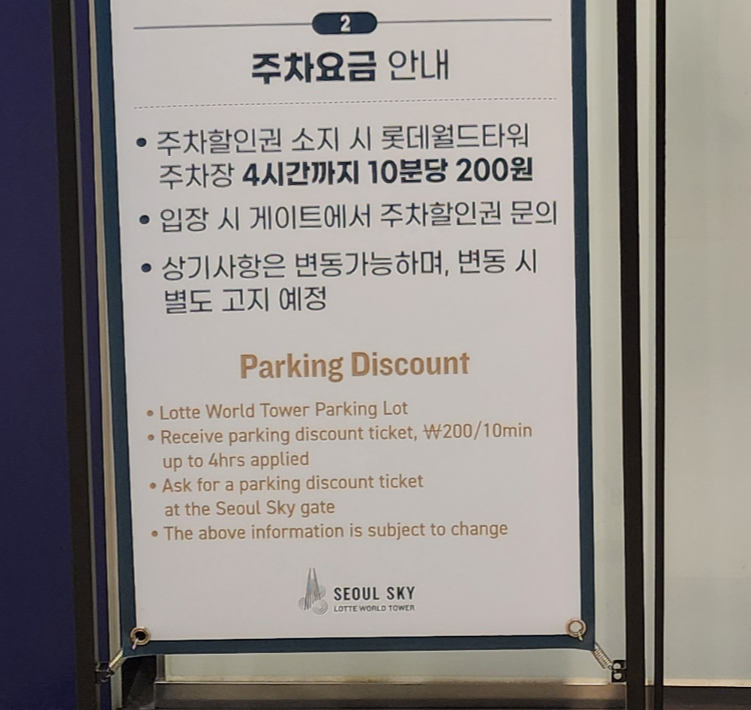주차요금은 주차 할인권 소지시 4시간까지 10분당 200원으로 책정되며 입장시 게이트에서 주차할인권 문의하면 된다고 나와있더군요.