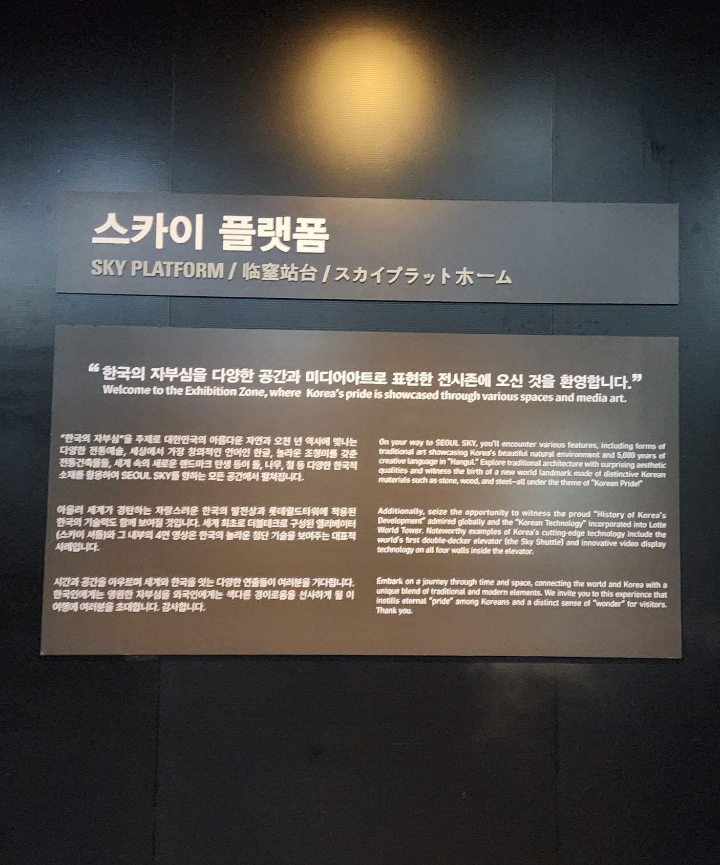 전망대로 올라가는 엘리베이터를 타기 전에 볼 수 있는 전시공간으로 서울스카이 건축과 관련된 내용과 미디어아트를 볼 수 있어요.