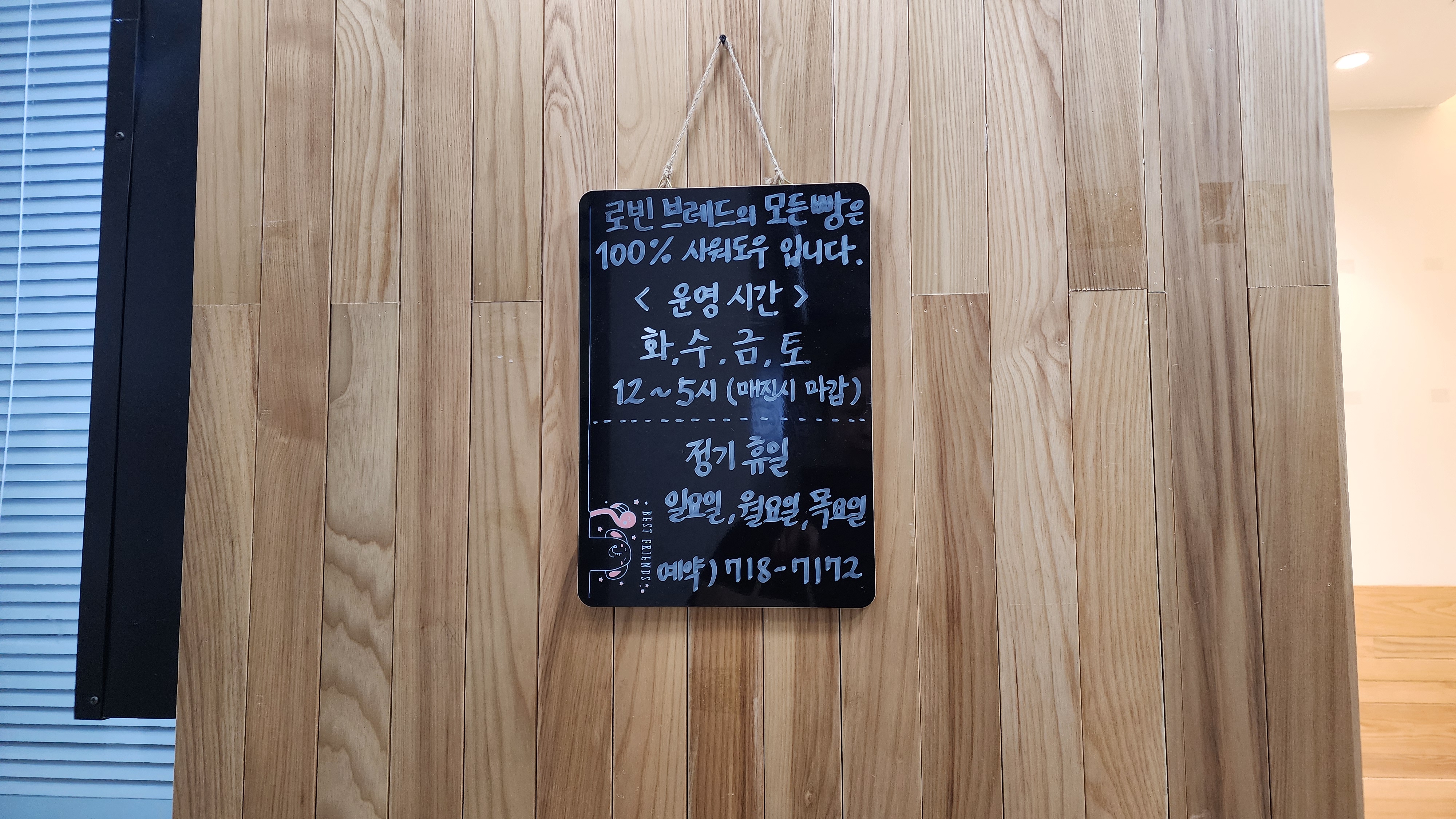 로빈브레드의 모든 빵은 100% 사워도우라는 안내와 함께 운영시간이 적혀있어요.