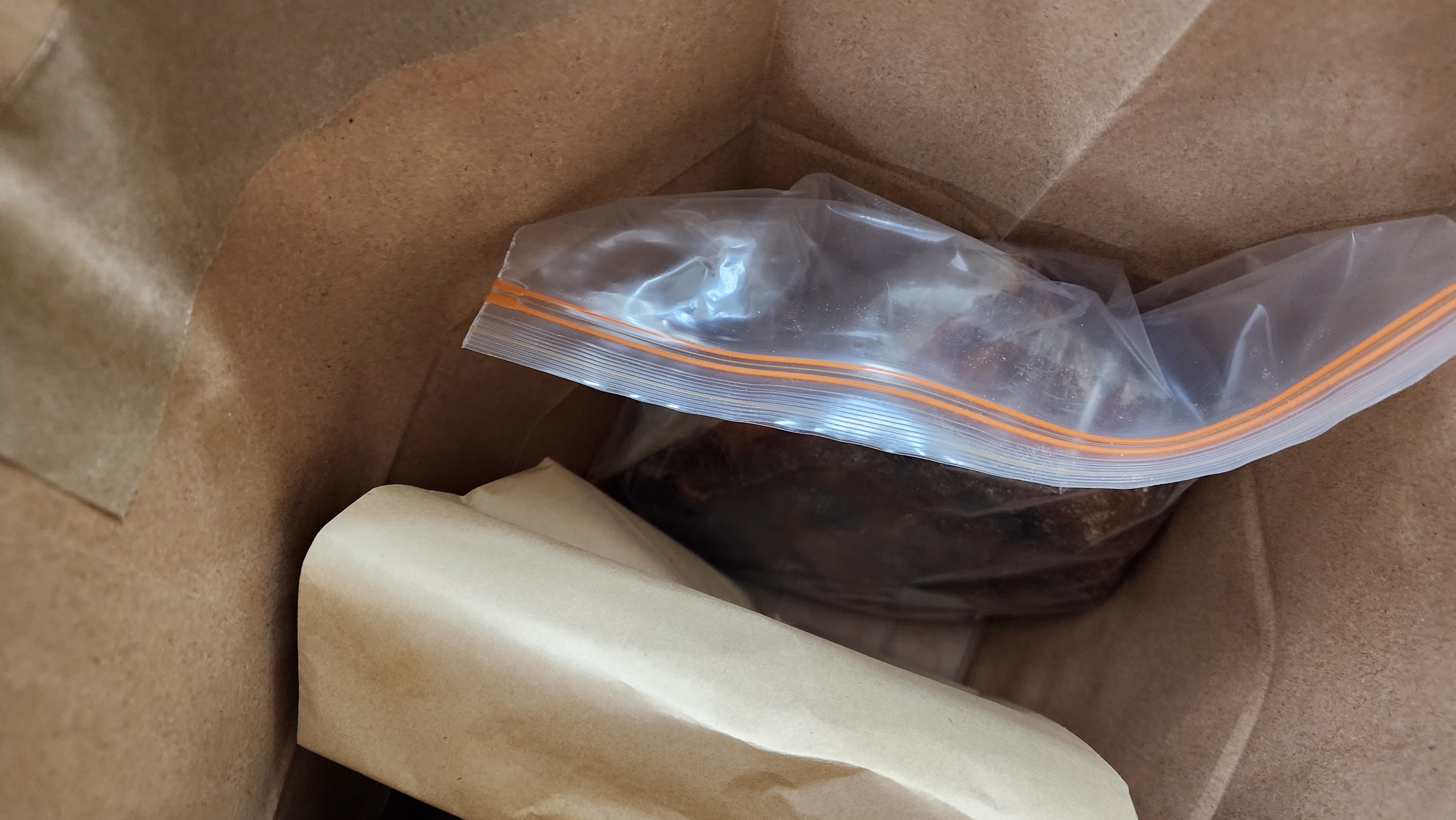 종이쇼핑백에 고다치즈 하프와 호밀스틱을 담아왔어요.