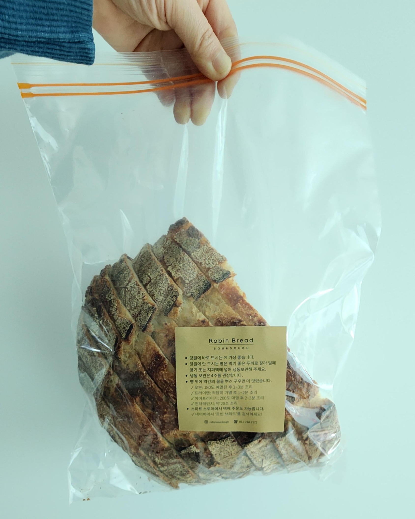 로빈브레드의 모든 빵은 발효빵인 사워도우로 천연발효 제법으로만 만든다는 소개와 이스트, 첨가제, 우유, 계란, 설탕, 버터를 넣지 않는다고 적어두셨더라구요.
