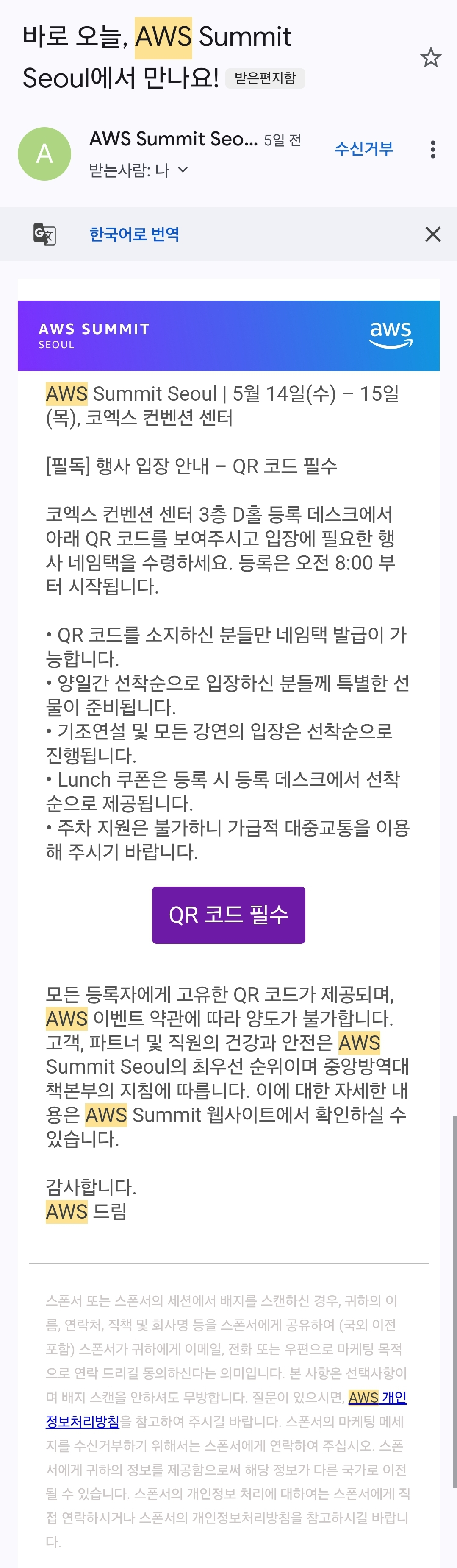 4월에 AWS 서밋 소식을 듣고 등록했더니 등록 확인 메일이 왔고, 서밋 이틀 전에도 안내 메일이 오더군요.