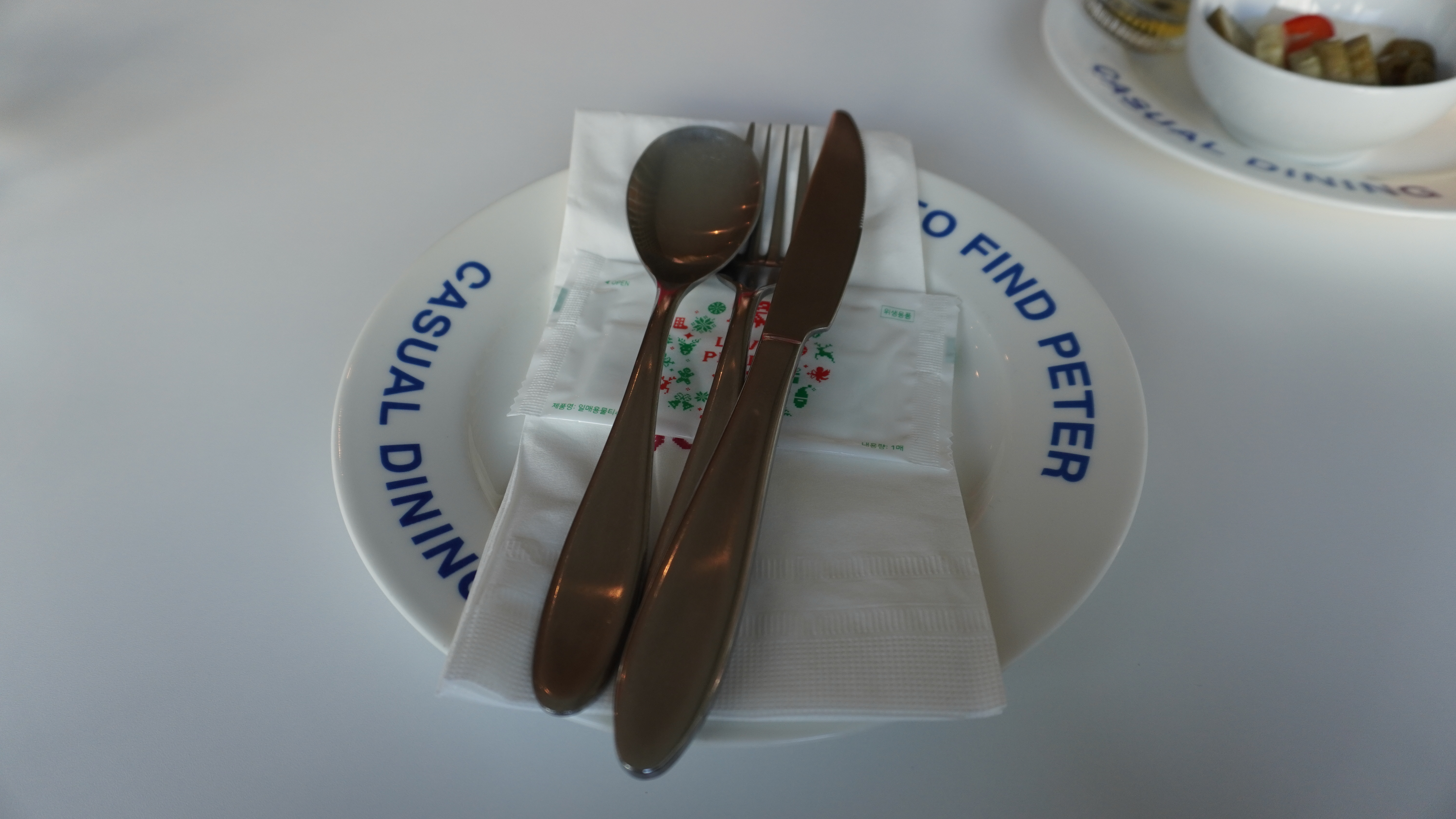 냅킨, 수저, 포크, 나이프, 앞접시가 놓여있었어요.