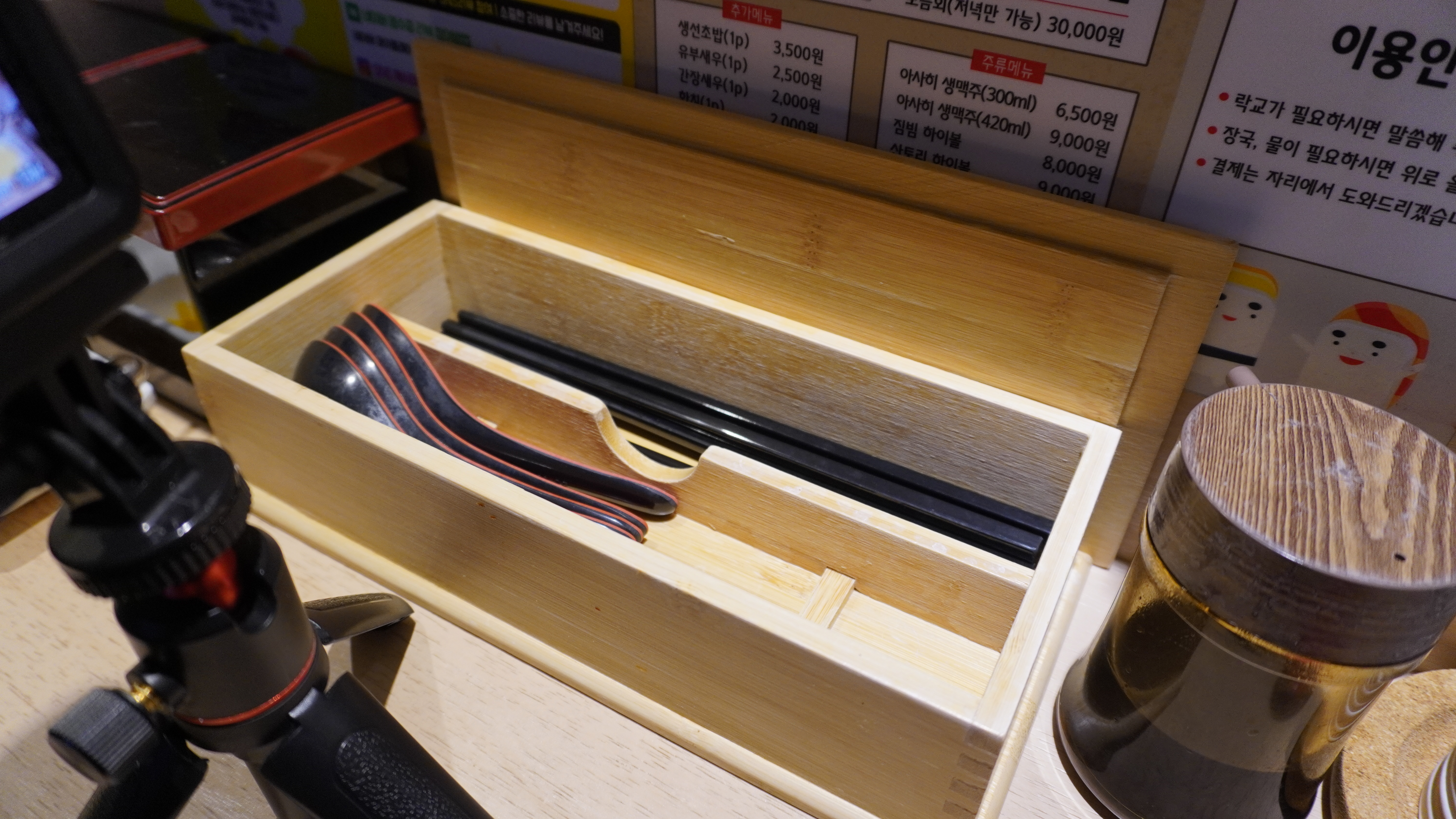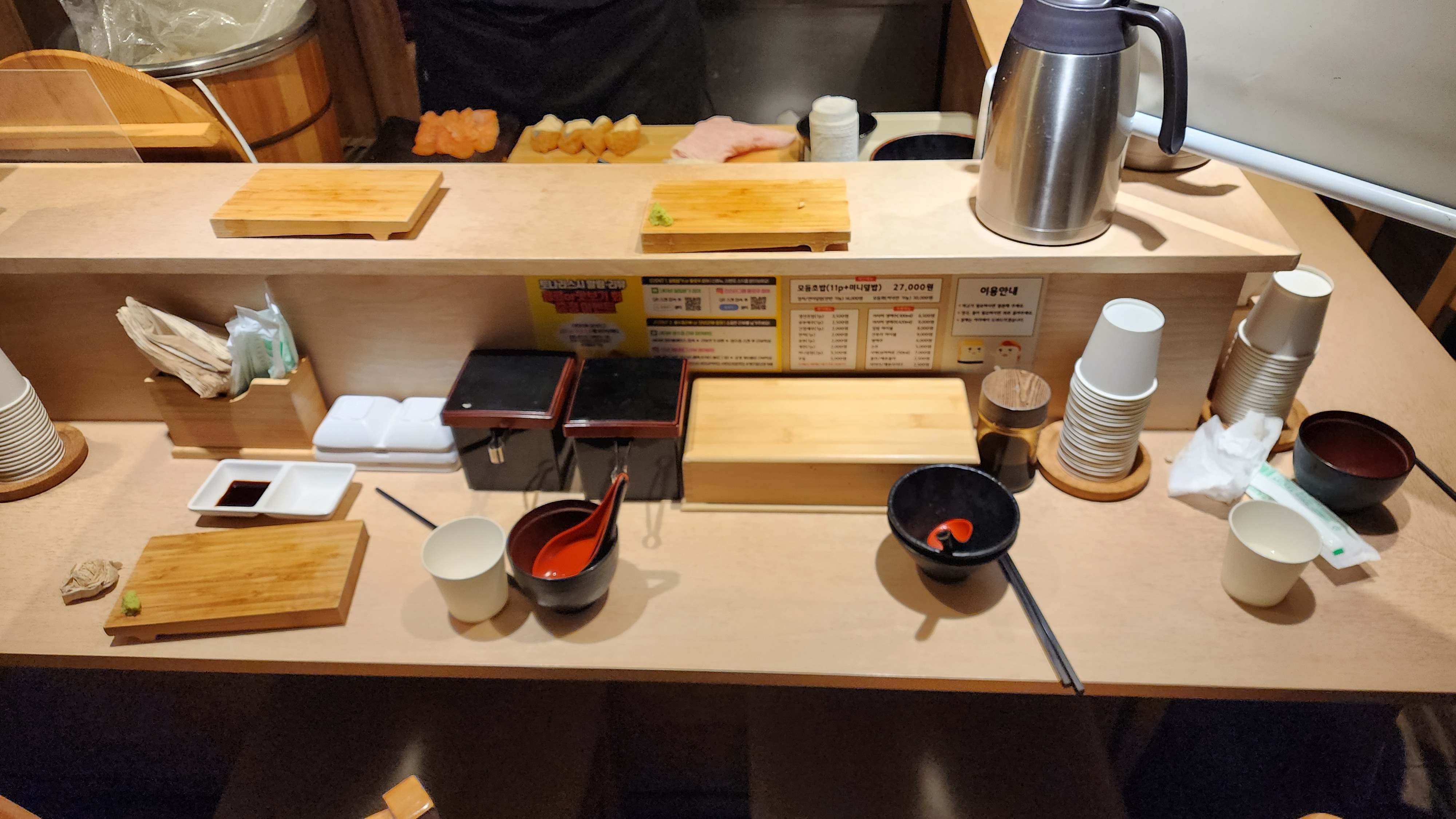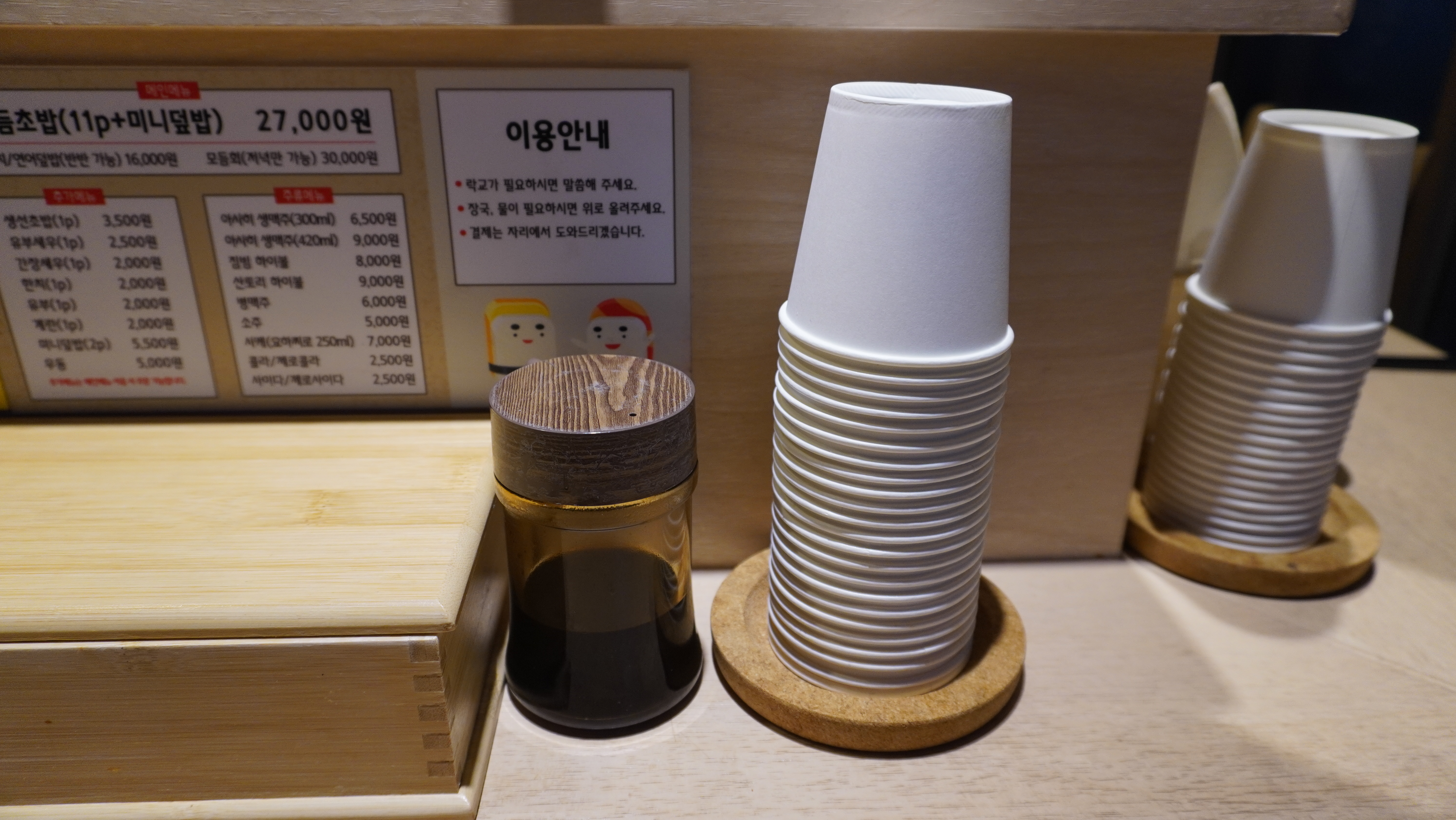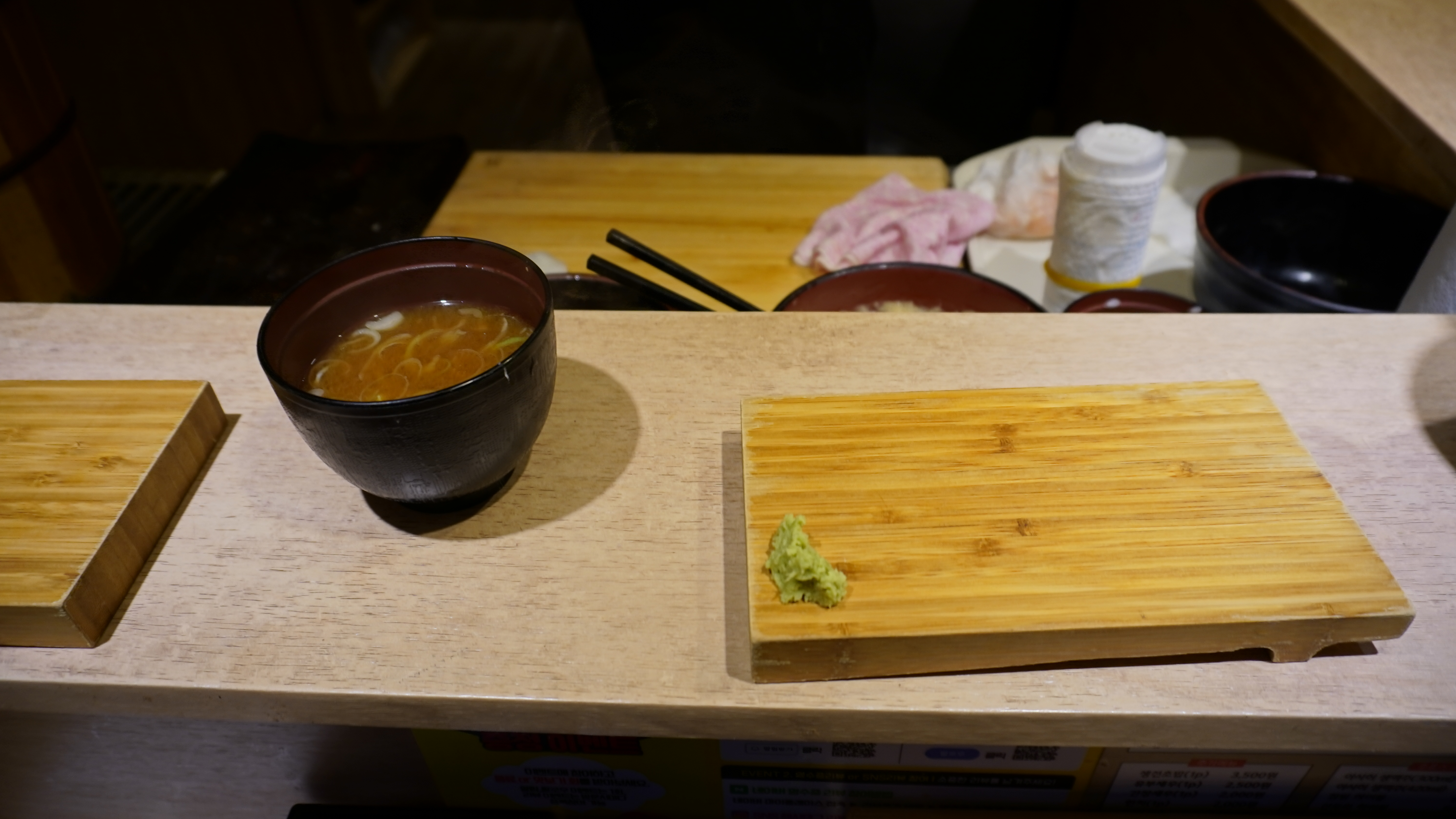 간장, 종이컵, 수저, 젓가락 물병은 놓여있었고 착석하니 장국을 주시면서 와사비 올린 작은 도마를 하나씩 놓아주시더라구요.