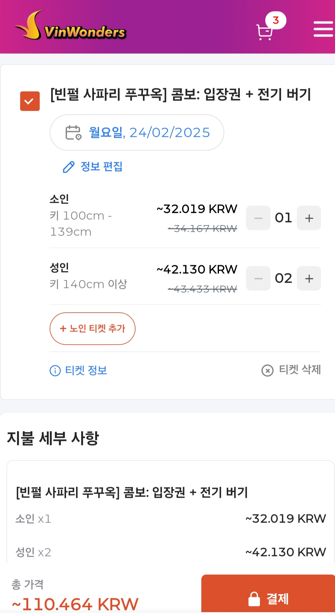 사파리 입장권 외에 콤보 메뉴로 동물원 트램이나 전기버기, 식당에서 사용 가능한 바우처 등을 묶어 판매하기도 하는데 빈펄 사파리 내에 있는 식당에서 식사하는게 좀 불편하다(음식 종류나 맛, 위생 등)는 평들을 봐서 입장권과 전기버기가 포함된 내용으로 예약을 진행했어요.