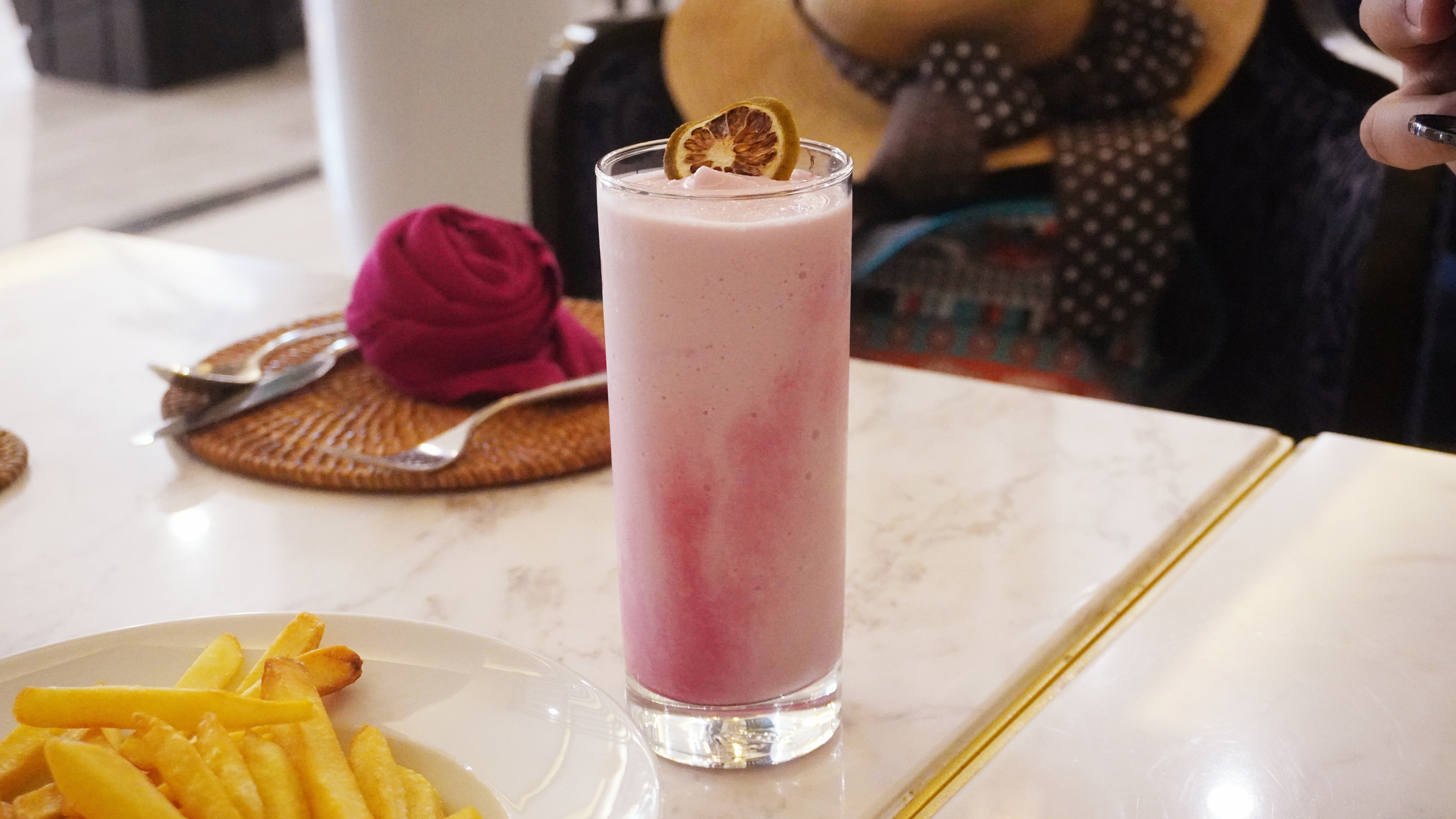 딸기 스무디는 건조된 과일칩이 올라가 있었고 빨대가 옥수수전분으로 만들어진 빨대 같았어요.