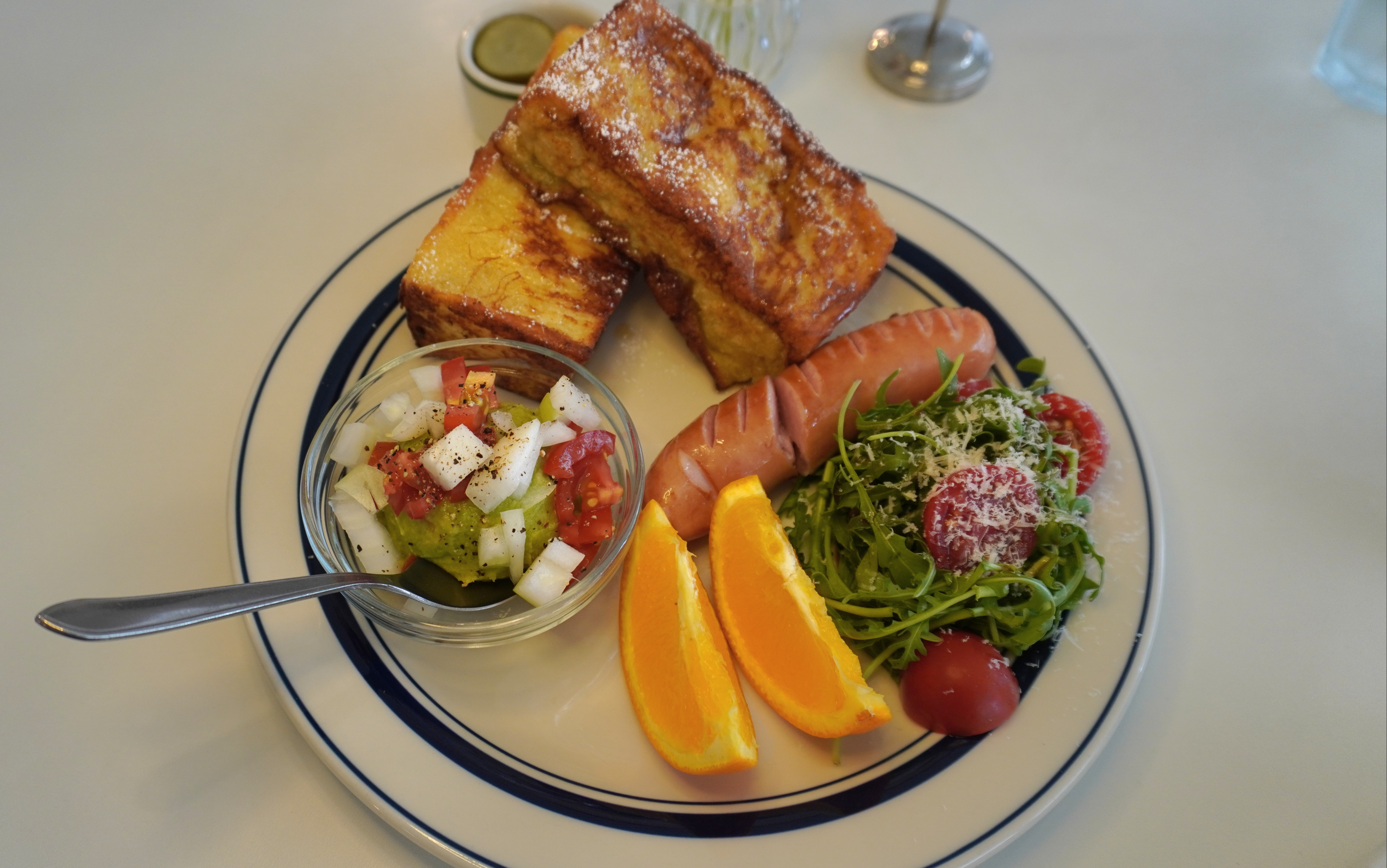 프렌치 토스트, 구운소세지, 루꼴라샐러드, 오렌지, 과카몰리가 한 접시에 올라간 브런치 플레이트 인데요 커피랑 아주 잘 어울리더라구요.