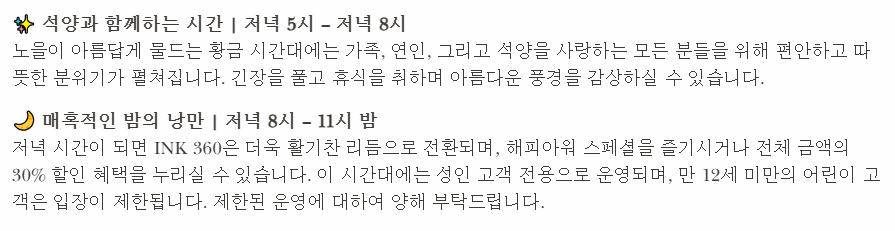 밤에 아이를 동반해서 ink360 갈 수 있는지 문의했더니 가능하지만 저녁 8시 이후에는 분위기가 적합하지 않을 수 있다는 답변 받았어요. 혹시 아이를 동반하시려거든 8시 이전에 방문하시길 바랄게요.