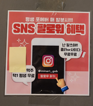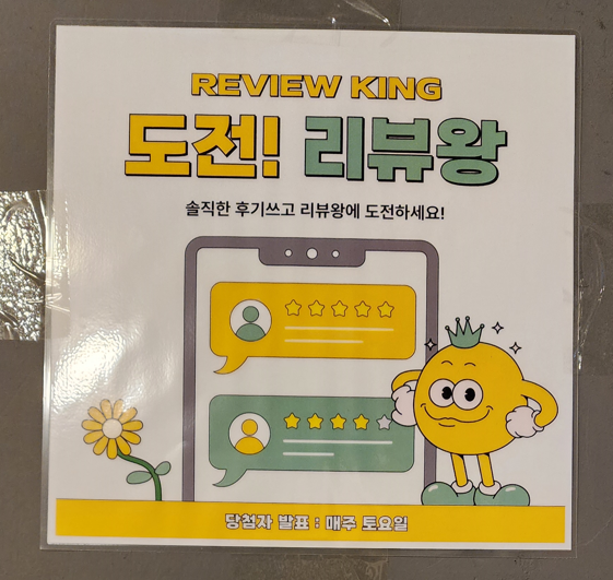 매장에서 식사 후 리뷰 작성시 매주 토요일마다 리뷰왕을 뽑는다니까 식사하시고나서 리뷰도 남겨보시고, SNS 팔로워는 맥주나 탄산음료를 받을 수 있다고 하니 인스타그램 팔로우도 해보셔요.