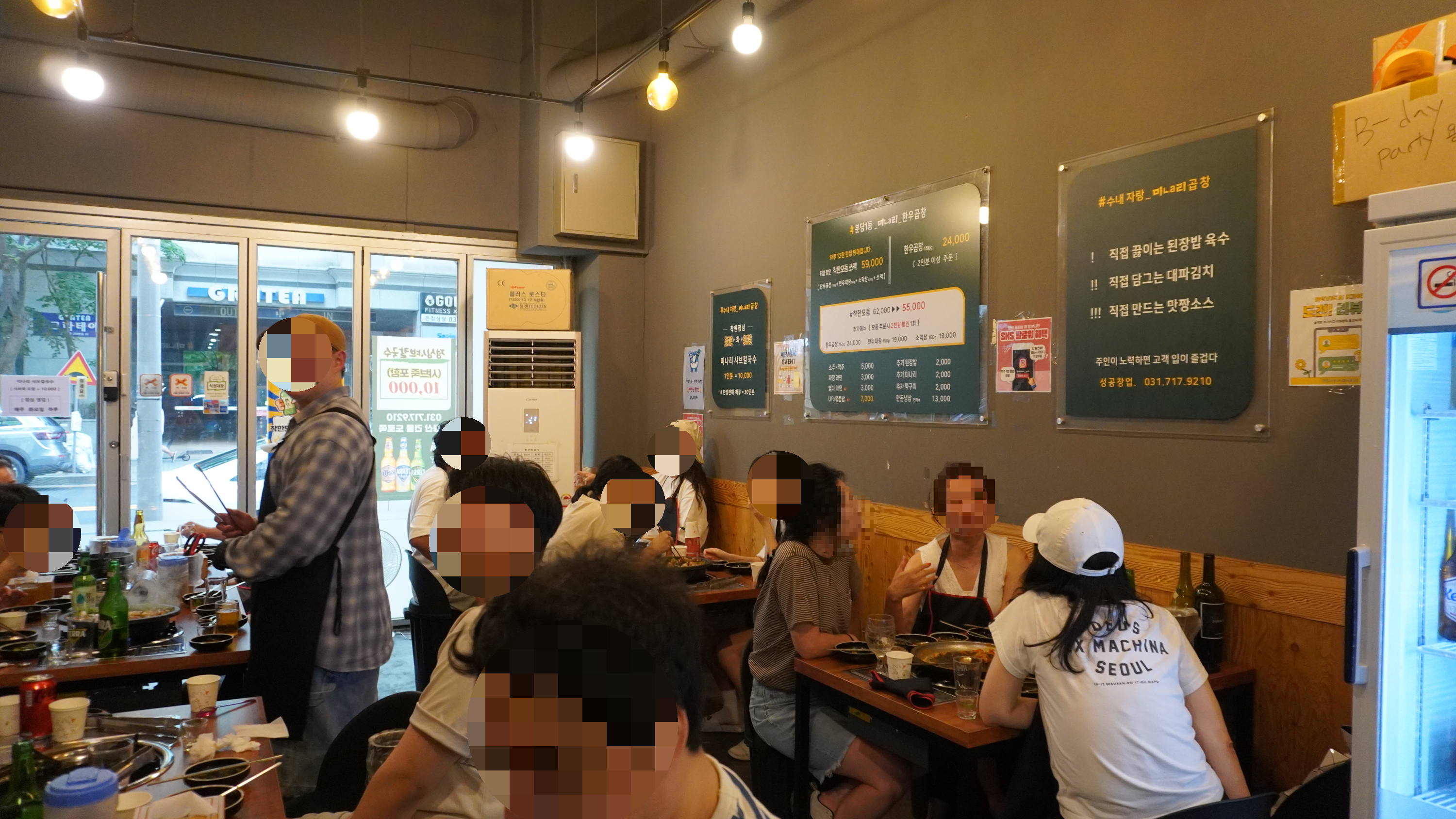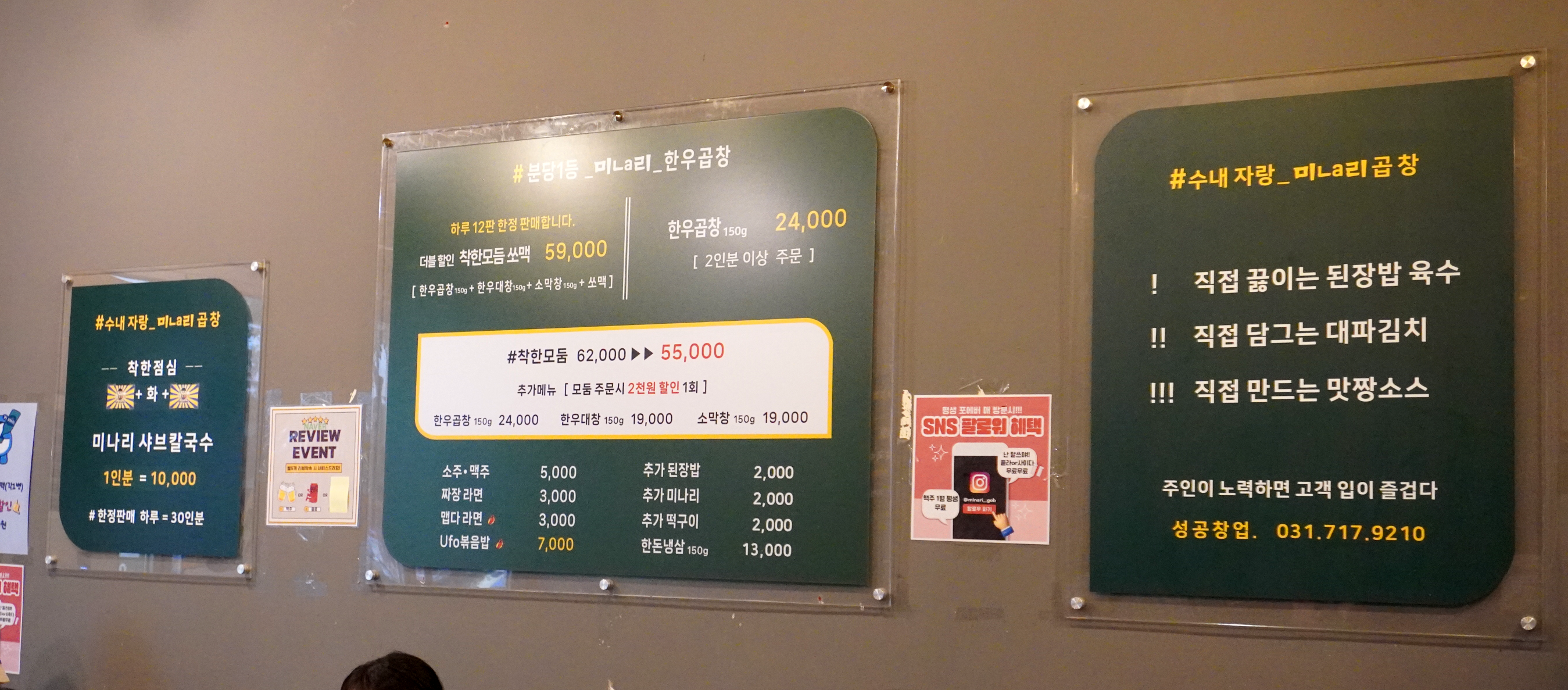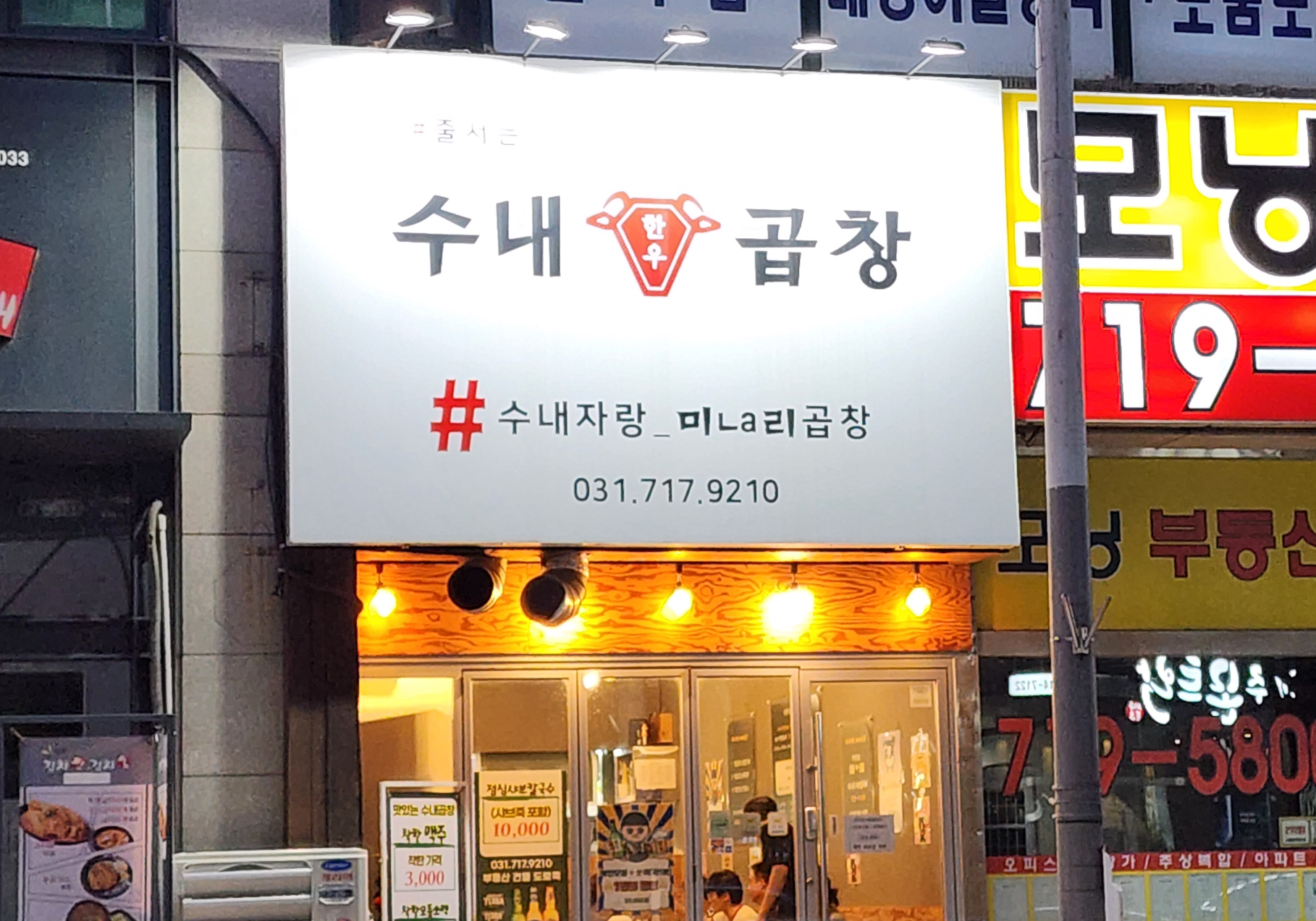 간판에 #줄서는 수내 한우 곱창 #수내자랑_미ㄴa리곱창 이라고 적혀있더군요.