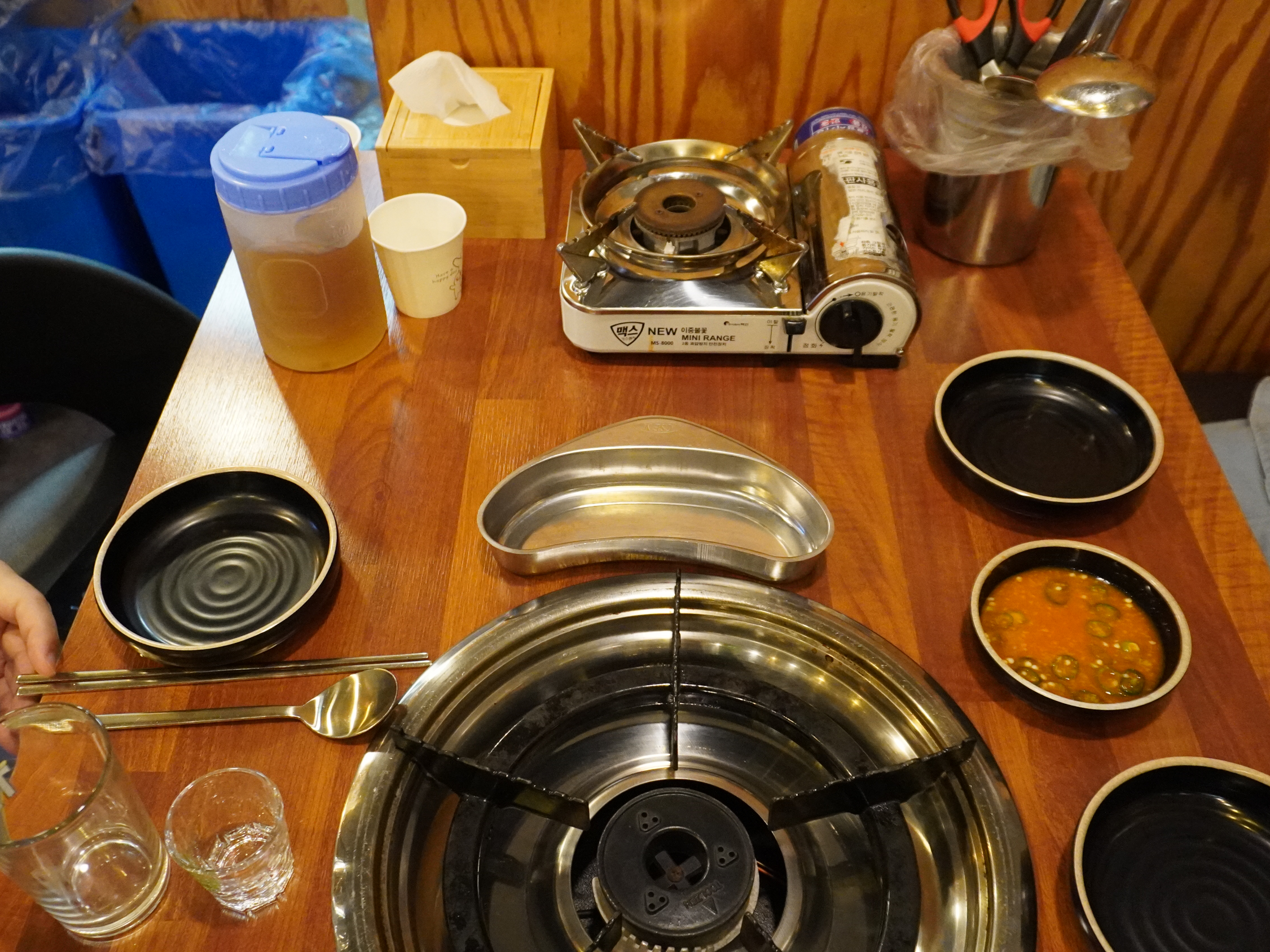 냅킨, 앞접시, 직접 만든 맛짱소스(곱창에 찍어먹으면 맛있어요), 얼린 곡물차(여름에 얼음물 제공되는거 너무 좋아요),종이컵, 가위, 집게, 국자 등이 셋팅 되더라구요.