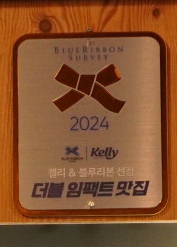 식당에 들어서면 눈에 띄는 곳에 블루리본 서베이와 켈리가 선정한 더블 임팩트 맛집이라는 현판이 있더군요.
