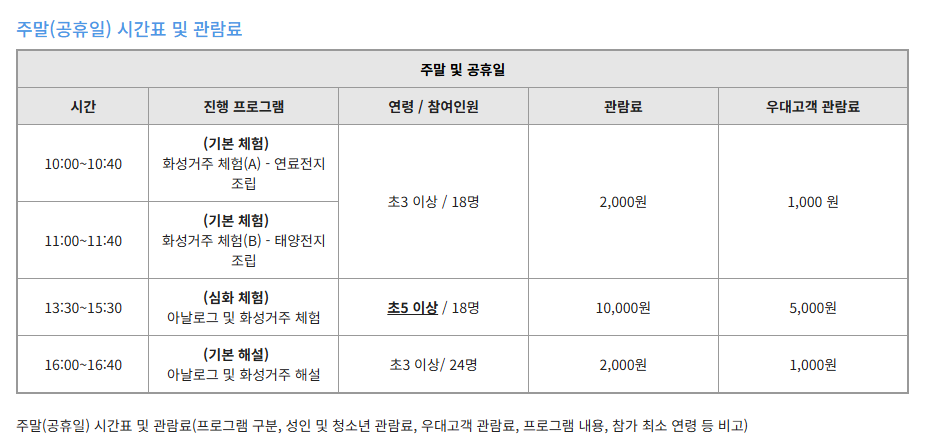 기본체험 초3이상 2,000원 / 심화체험은 초5 이상 10,000원