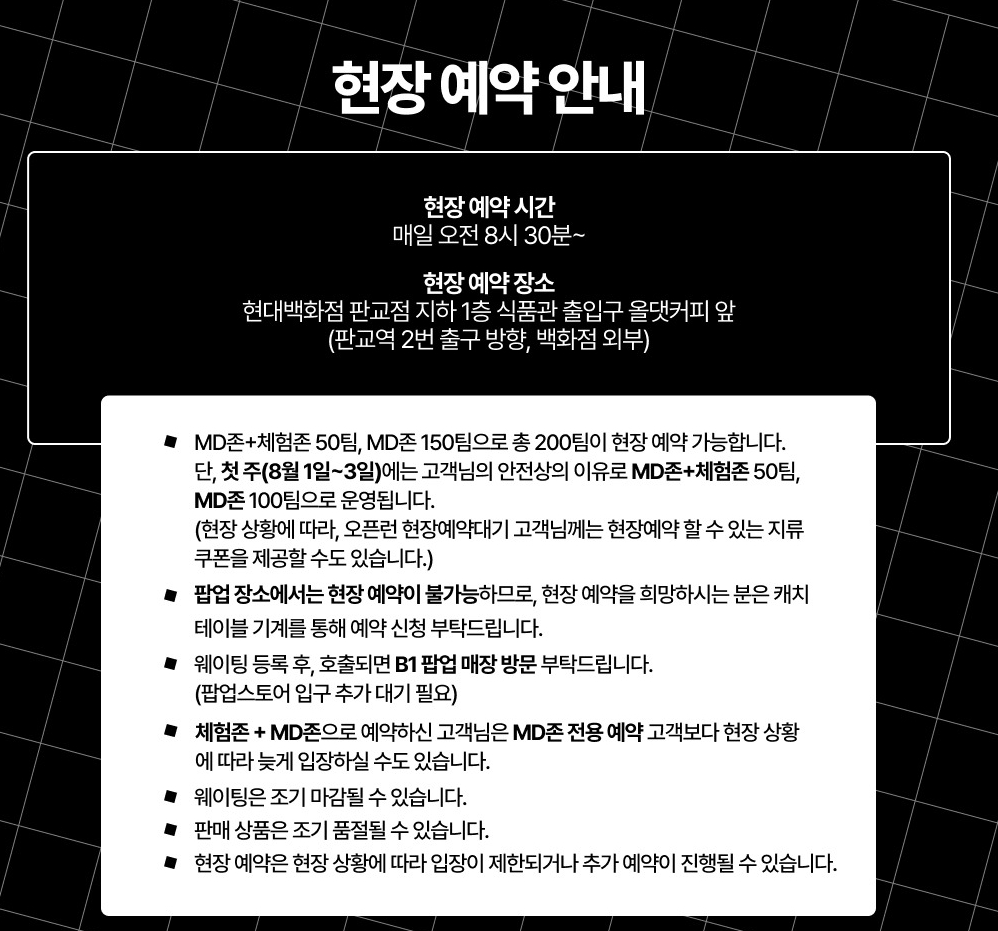 매일 오전 8시 30분 부터 예약이 가능하고 현장 예약 장소는 현백 판교 지하1층 식품관 출입구 올댓커피 앞이예요.