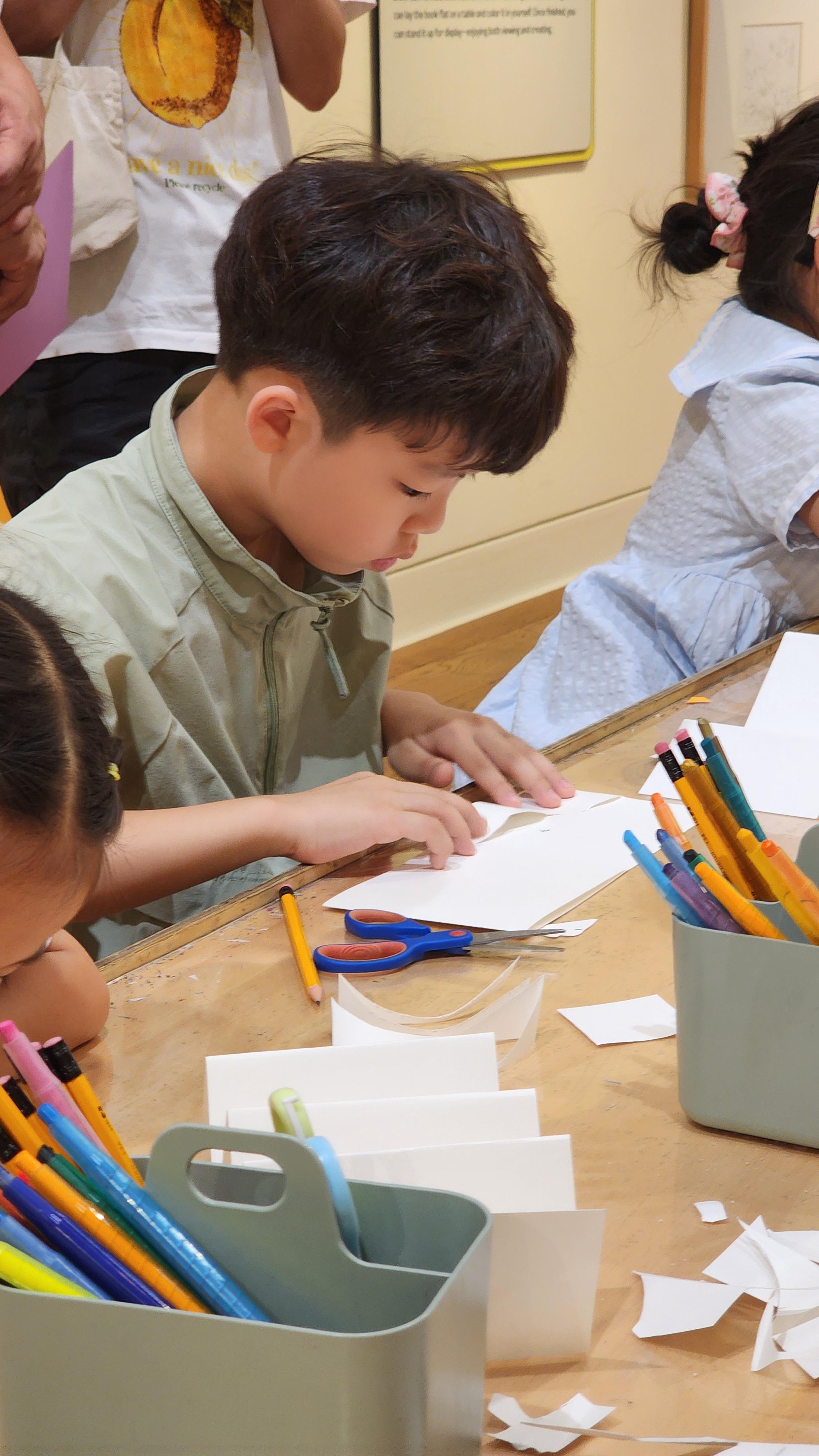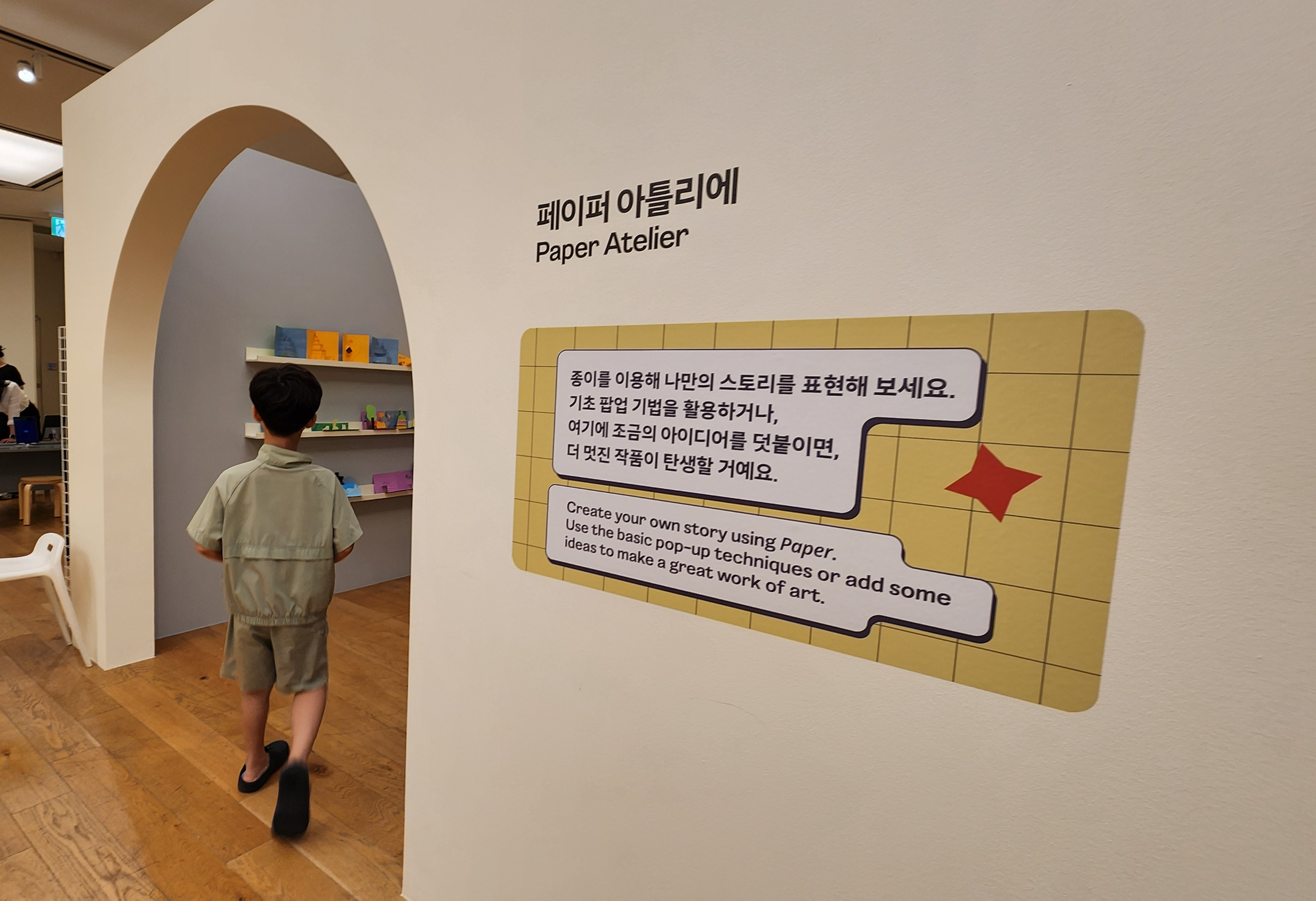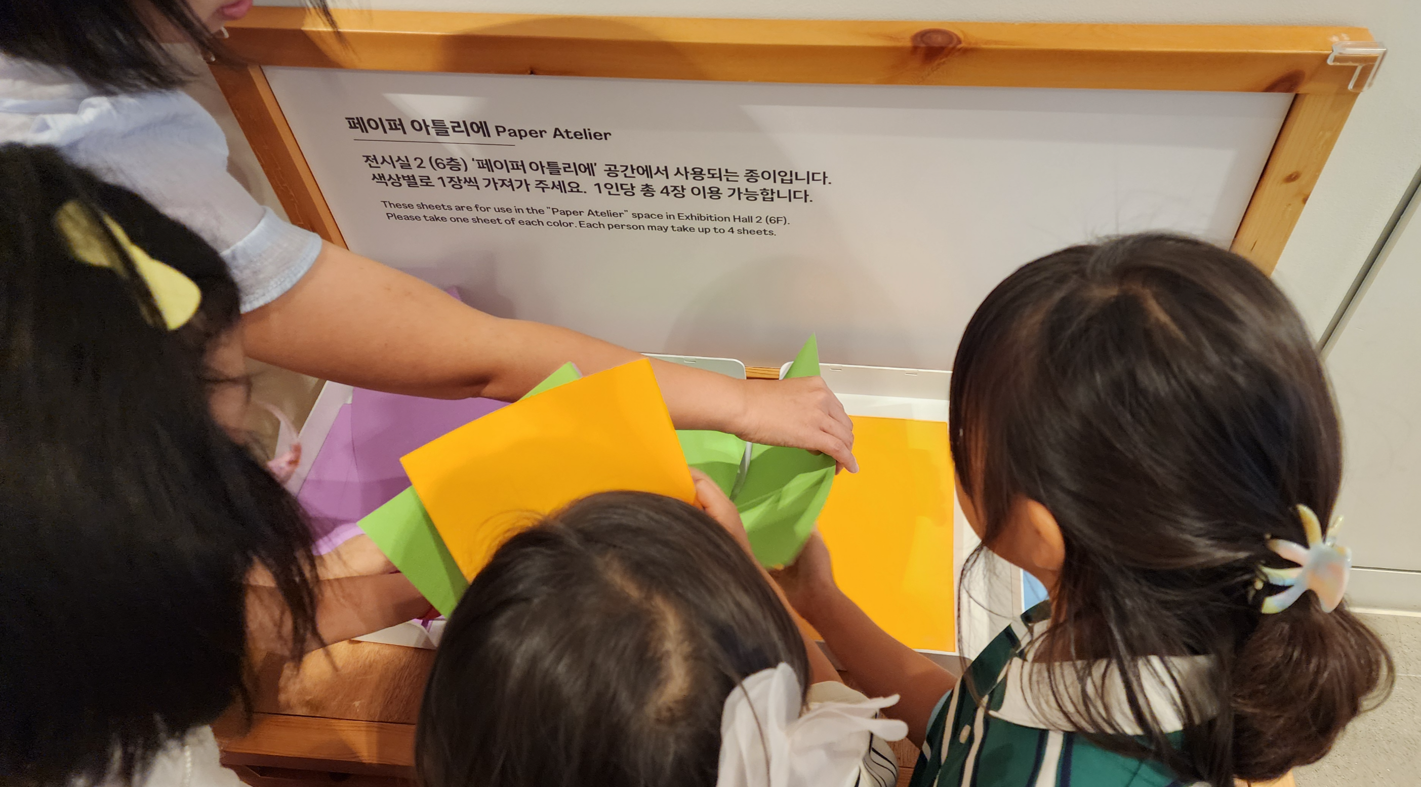 미술관 입장하자마자 아이들에게 종이를 골라서 가져가게 하던데요 전시 관람을 하는 기대감을 높여주기 위해서 인지는 모르겠지만 종이를 들고 다녀야 하는 약간의 수고로움(?)이 부모님들에게 있을 수 있어요.